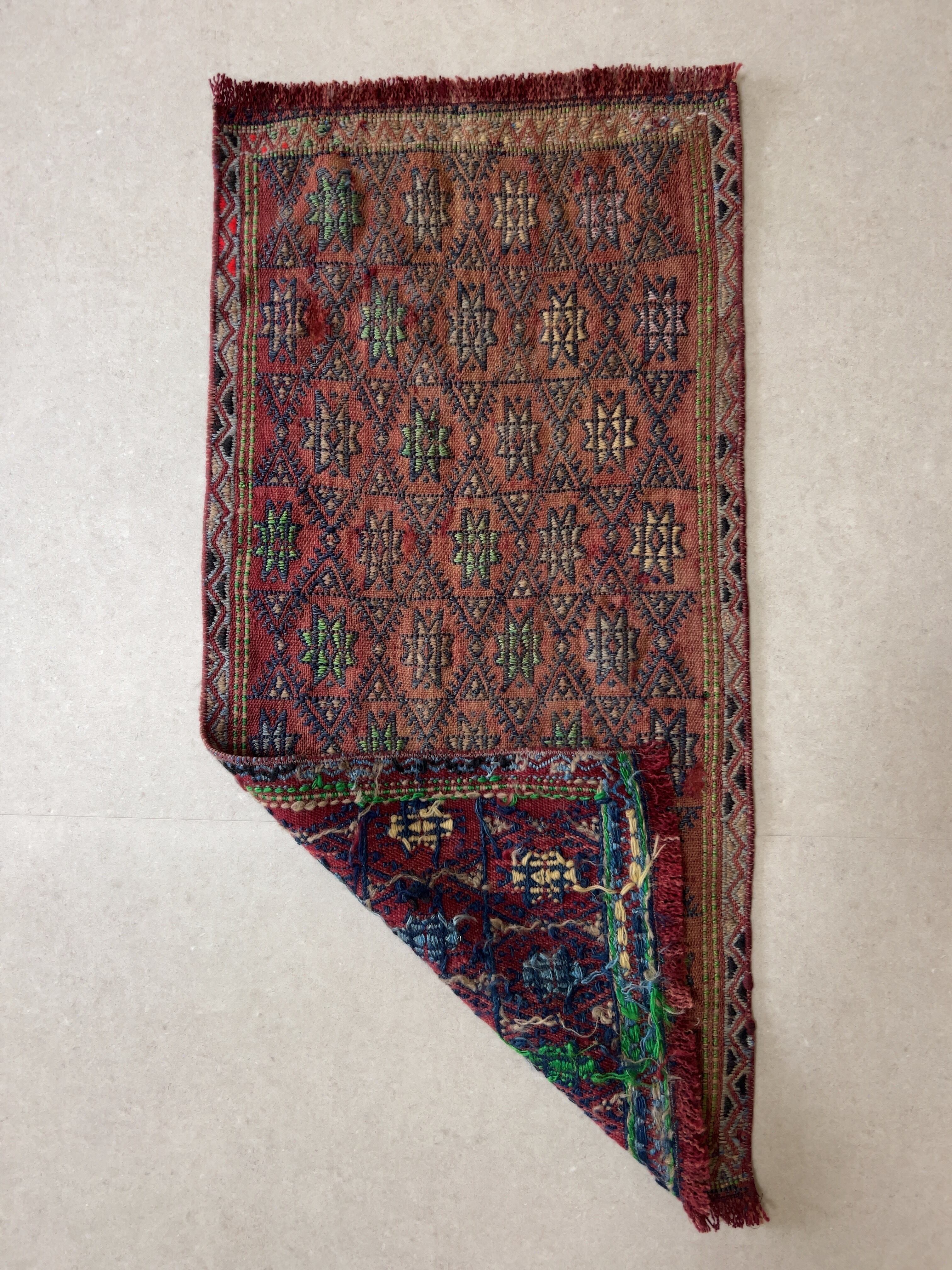 深みのあるくすんだ赤の色味は落ち着いた印象で、星型の模様と縁取りのジグザグ模様が美しく、見るほどにとても魅力的なラグです。