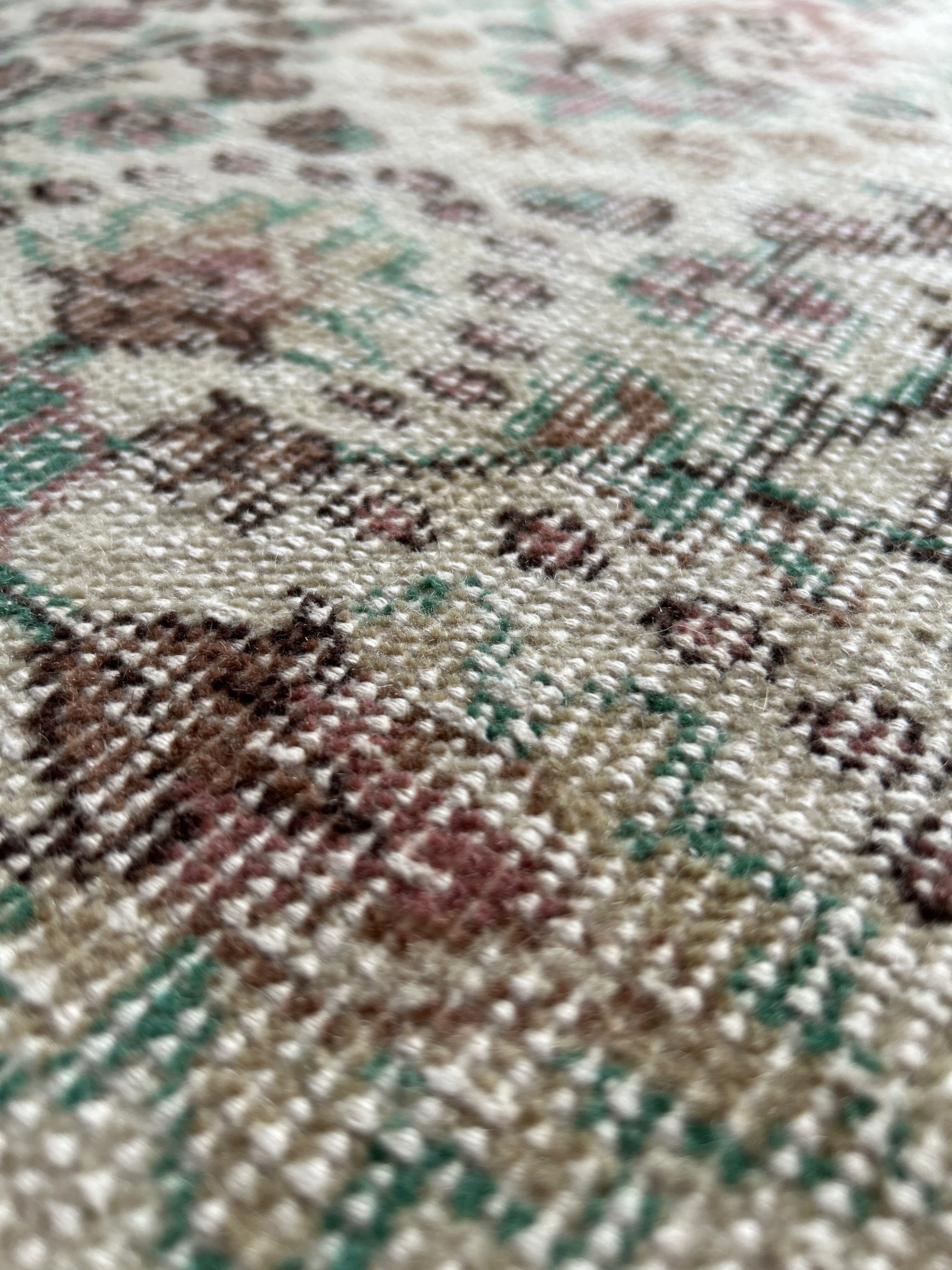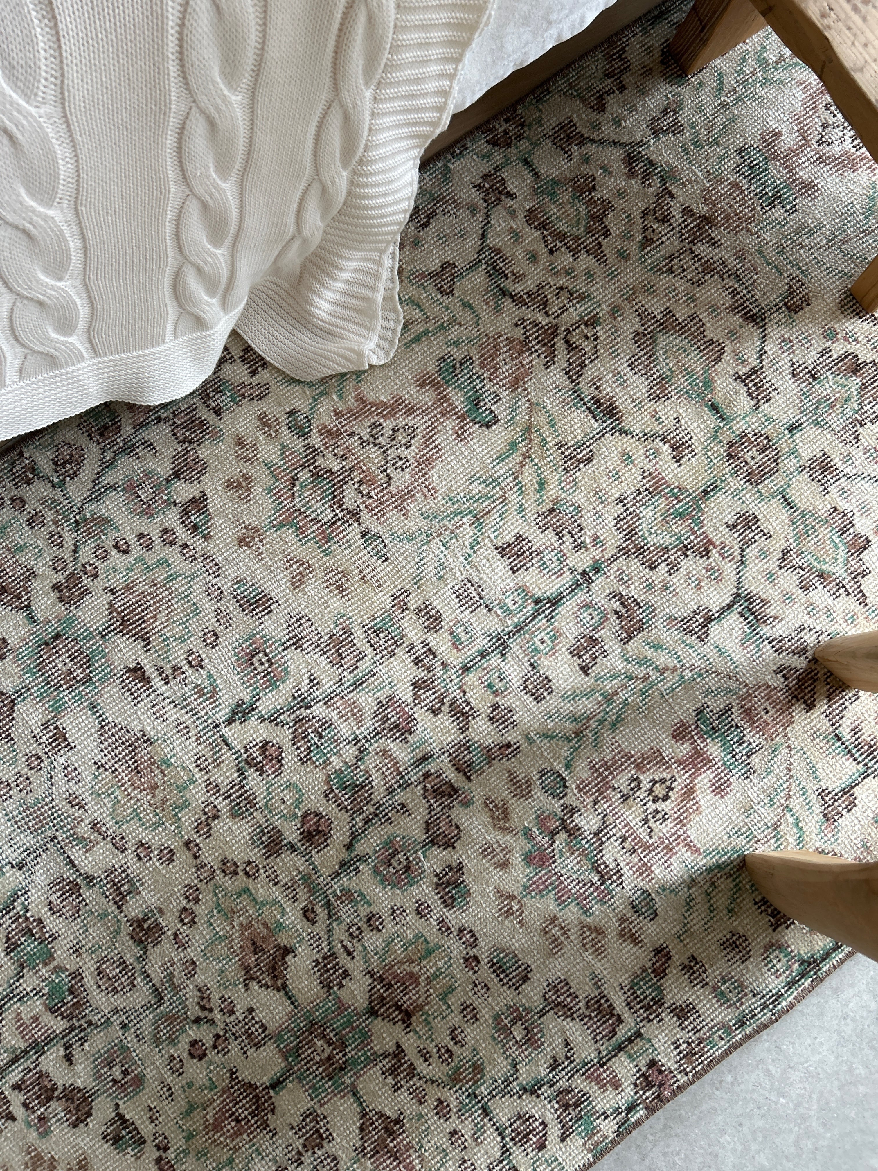 細かい花柄のデザイン・色使いがとても目を惹き、ヴィンテージらしいかすれも程よく入ったおすすめのラグです。
