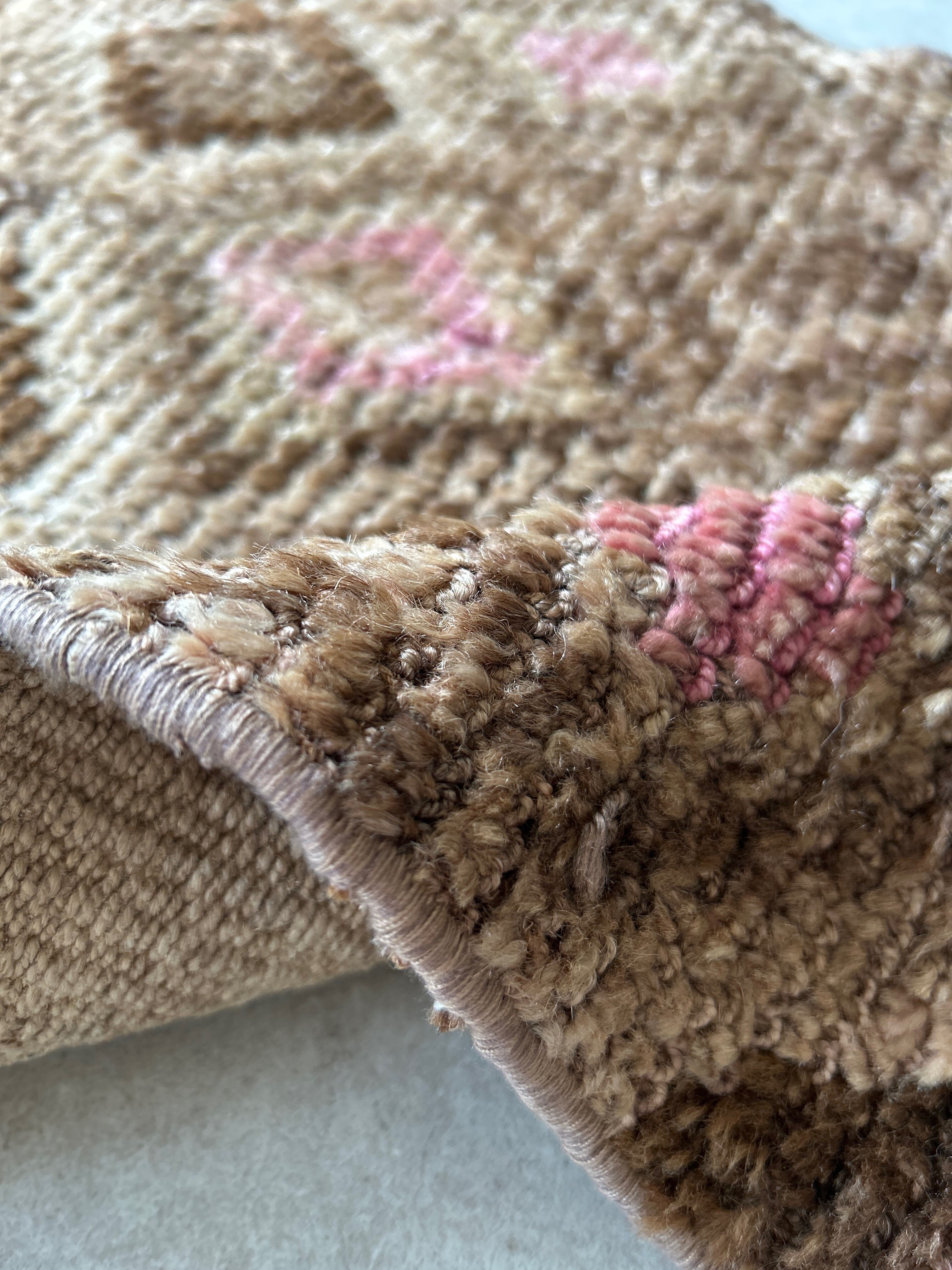 黄色味の少ないすっきりとしたブラウンとピンクの色使いがとてもかわいく、もこもこの毛足ととてもマッチしています。