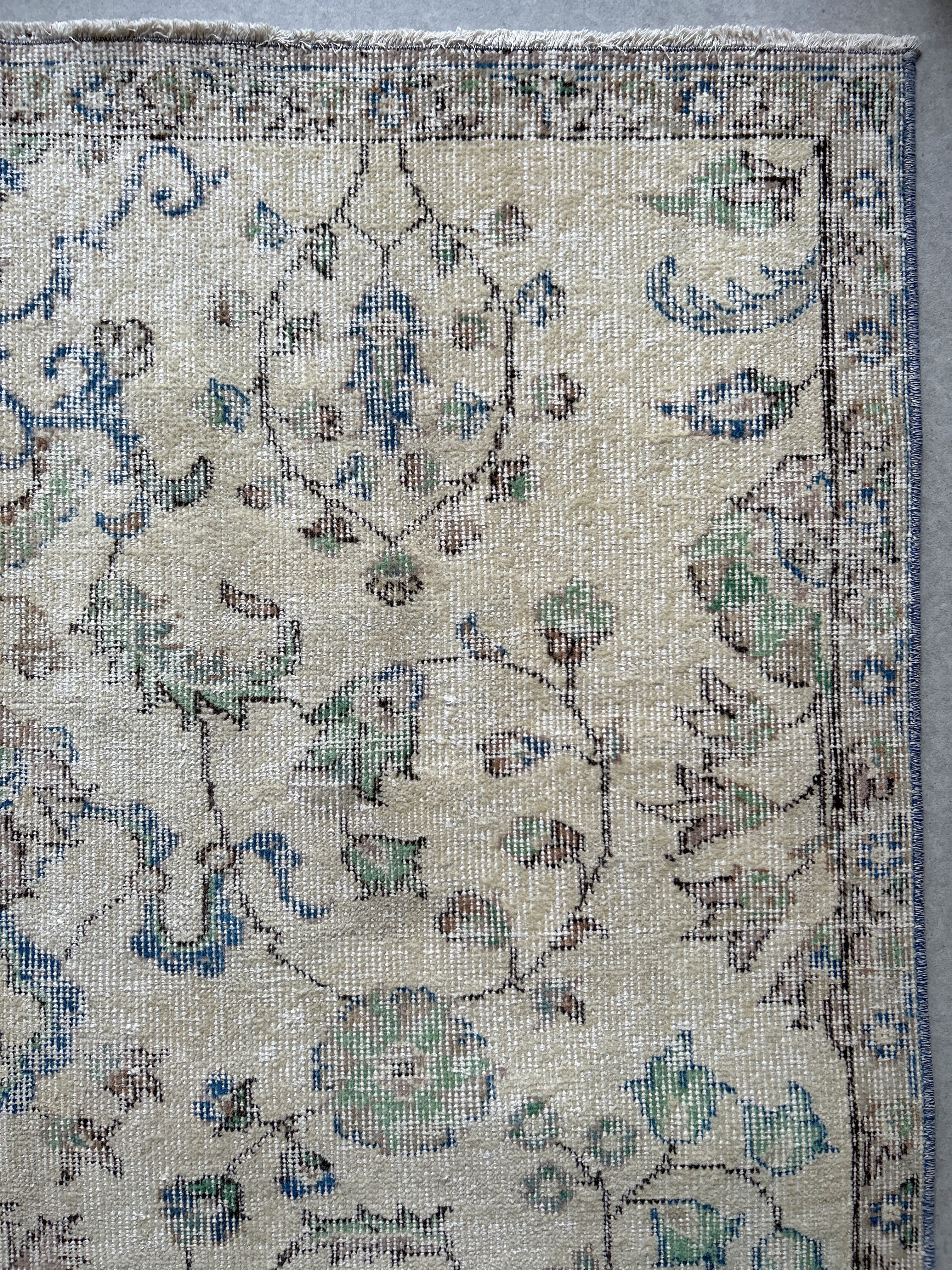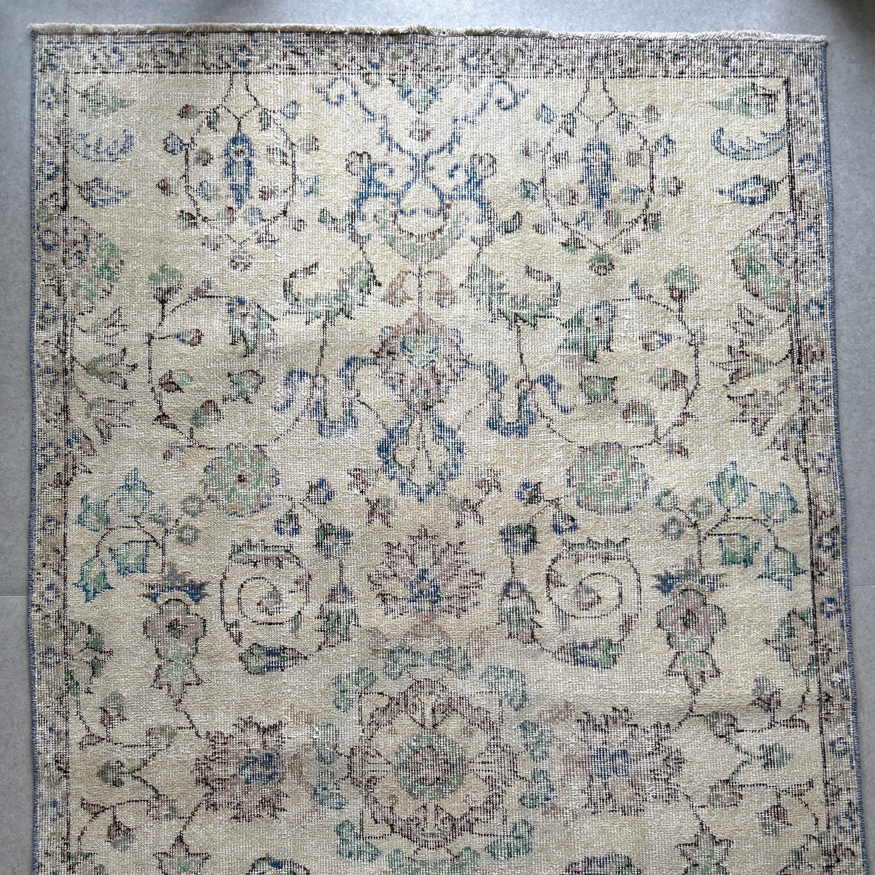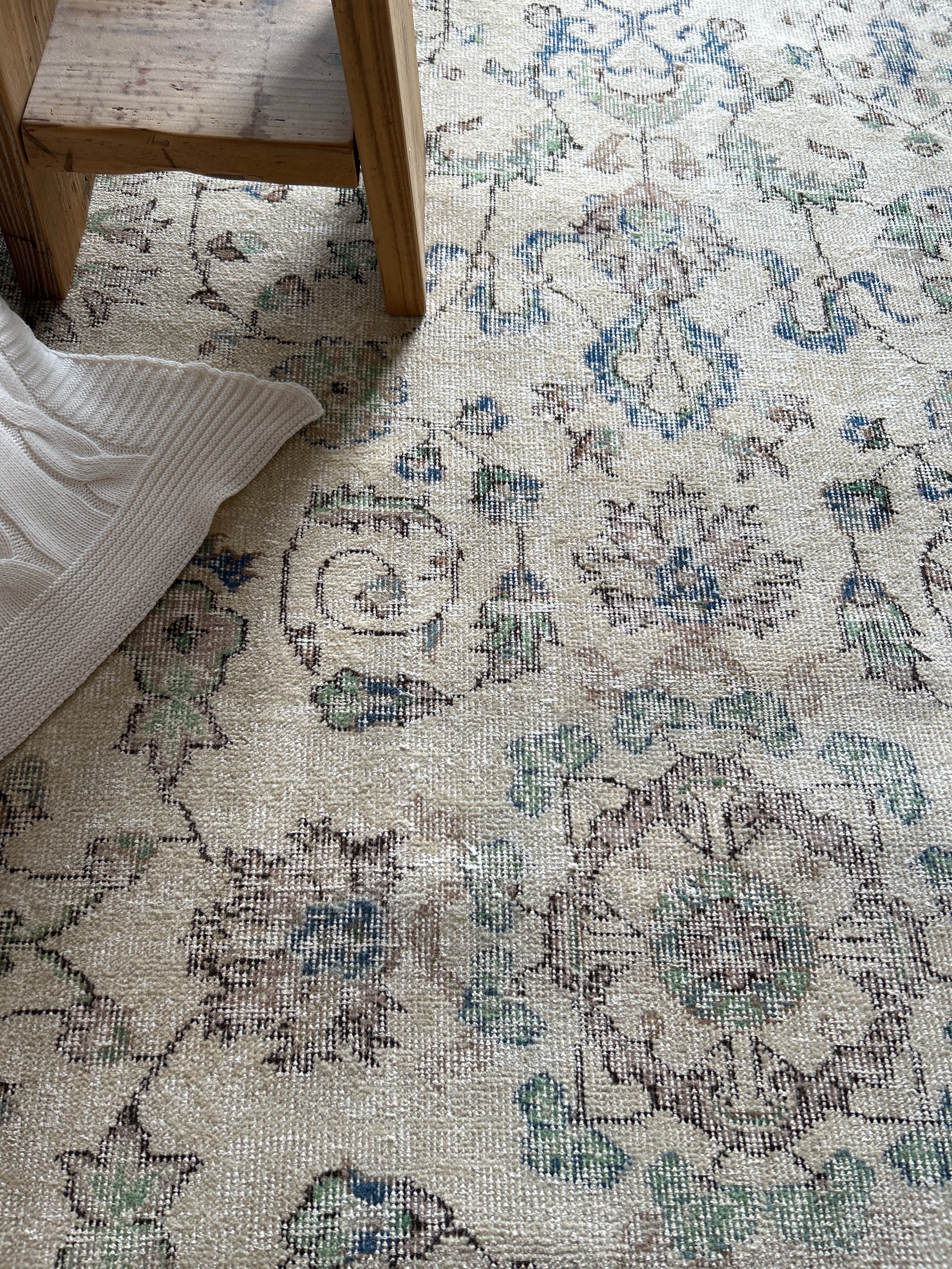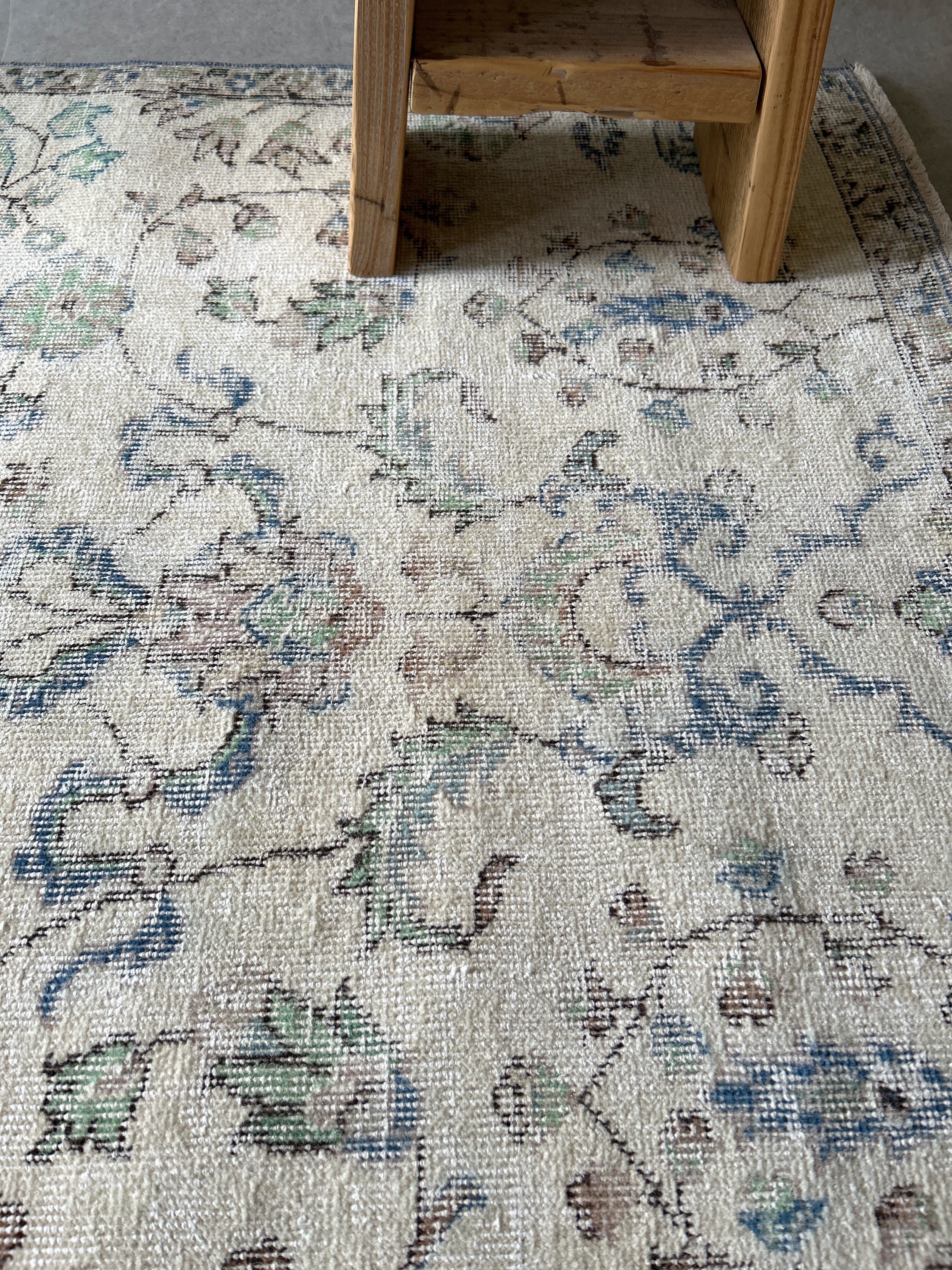 ナチュラルベージュのベースカラーにグリーンやブルーが少しアクセントになった、すっきりした花模様が洗練された印象のラグです。