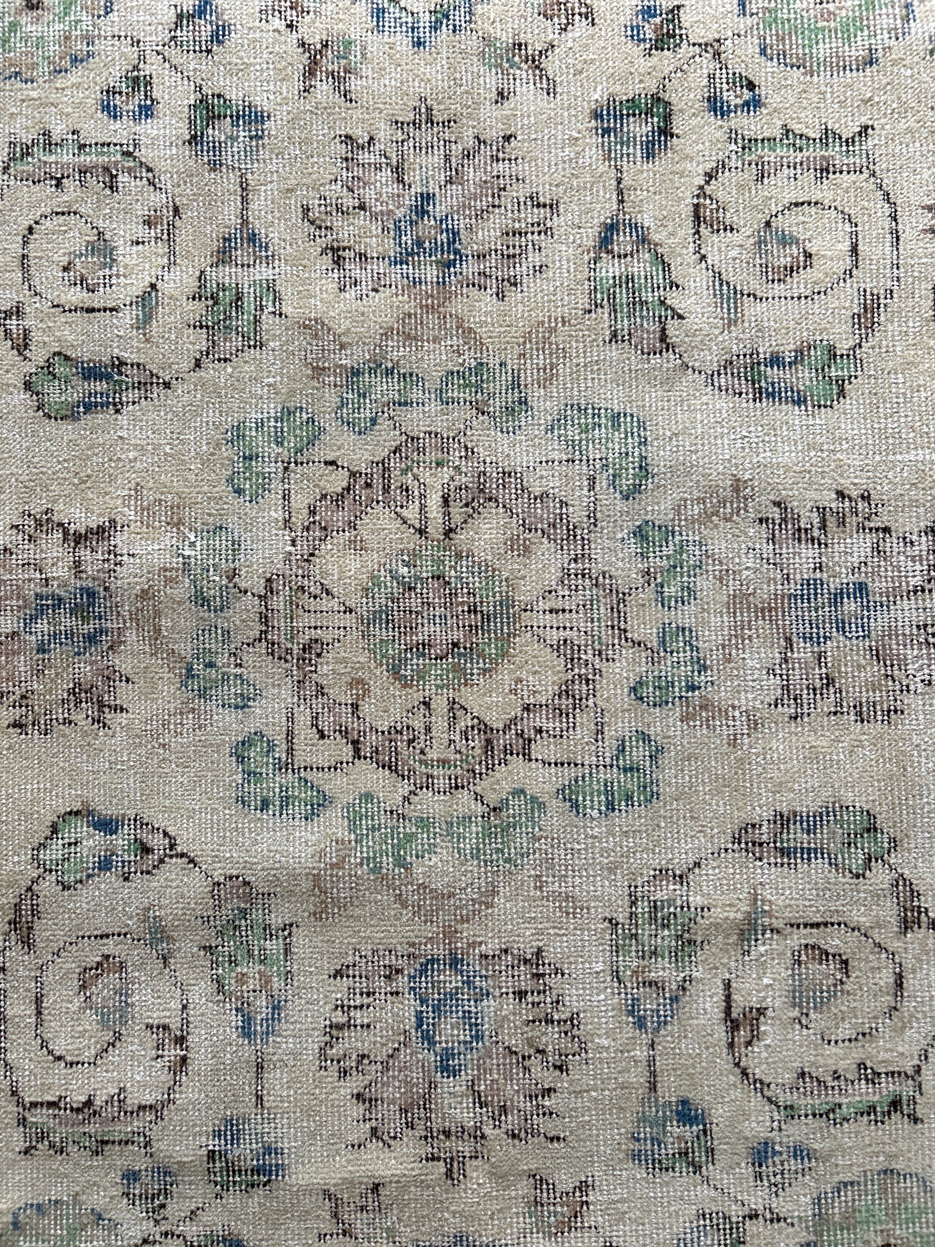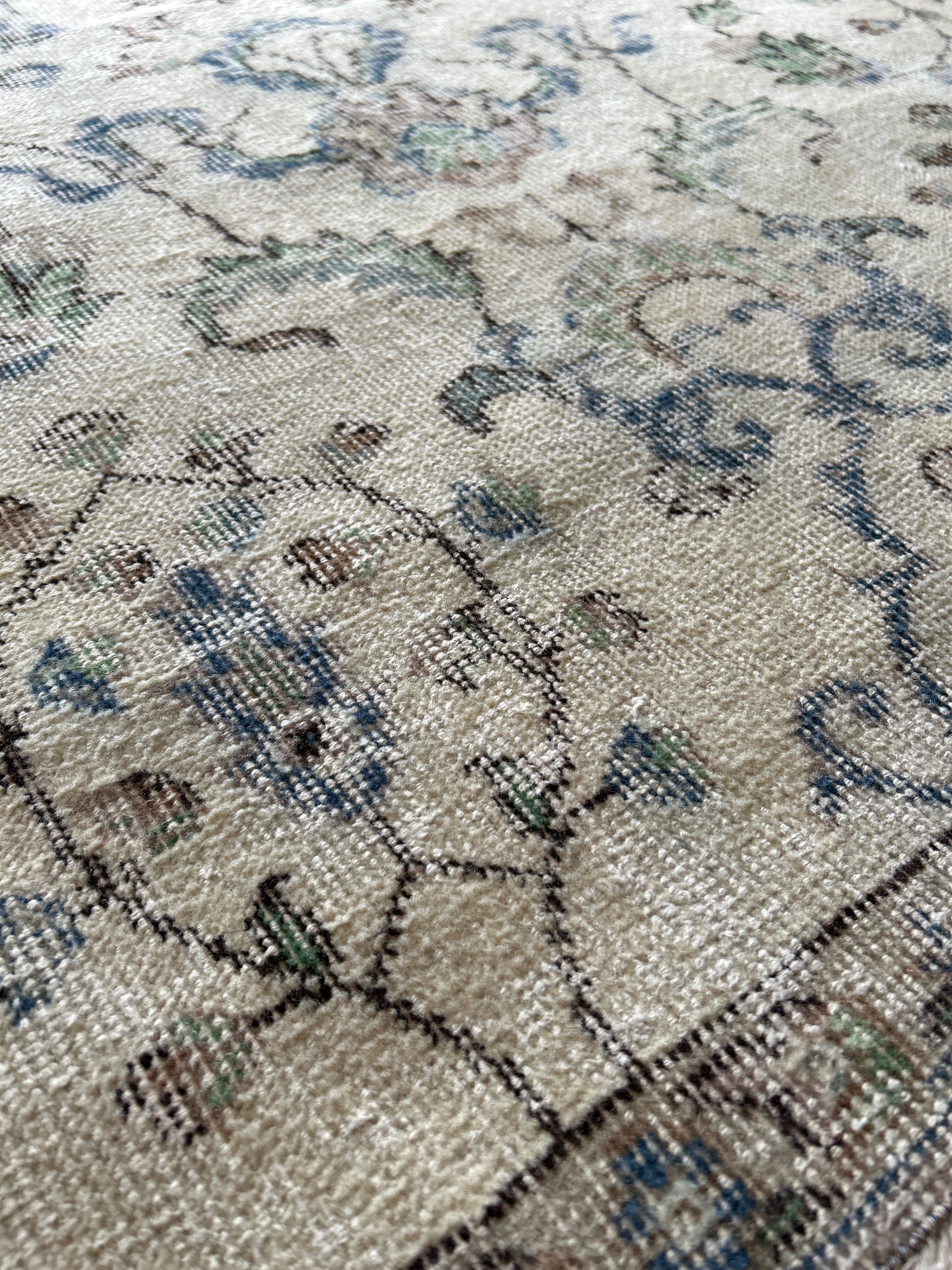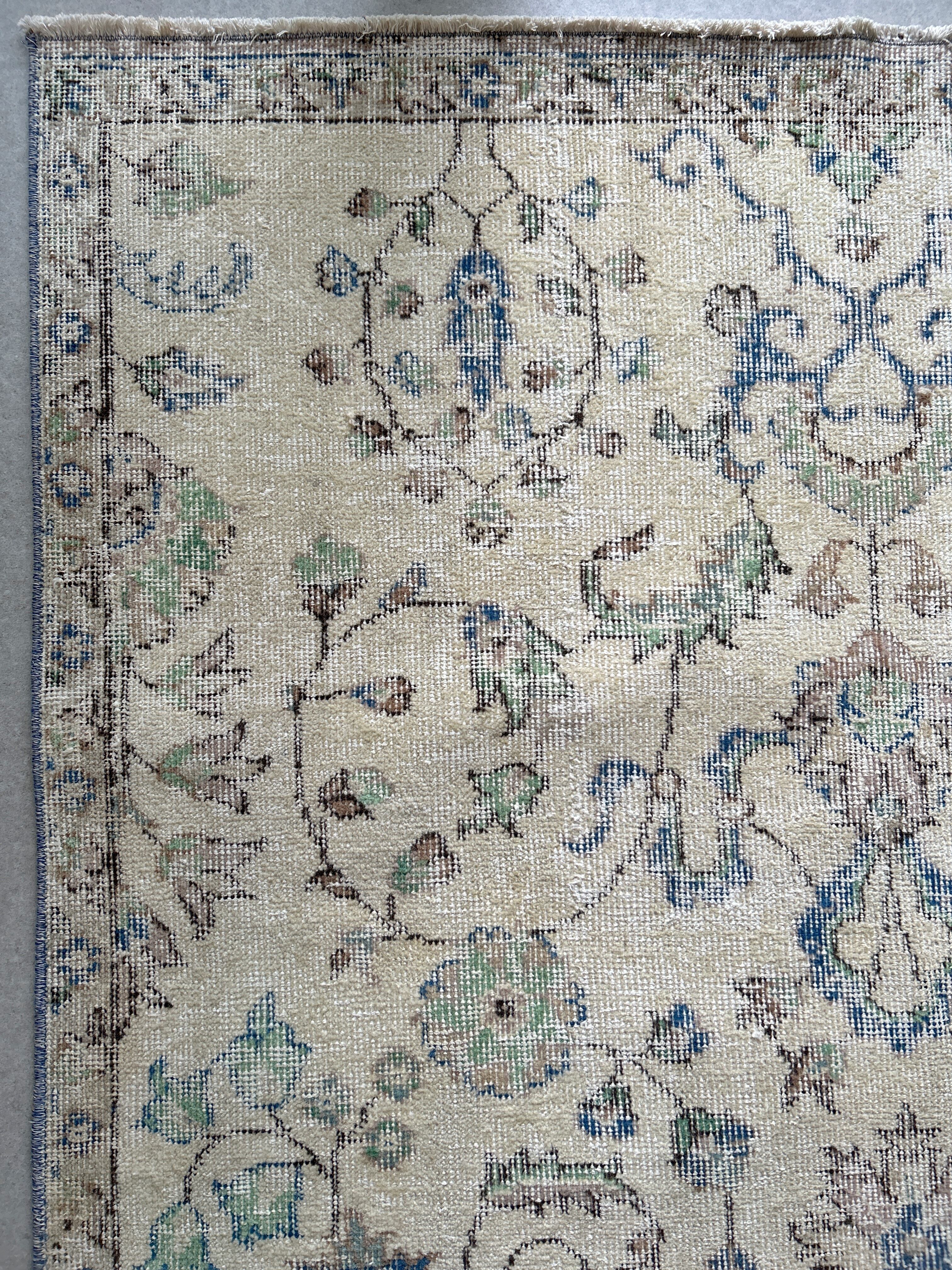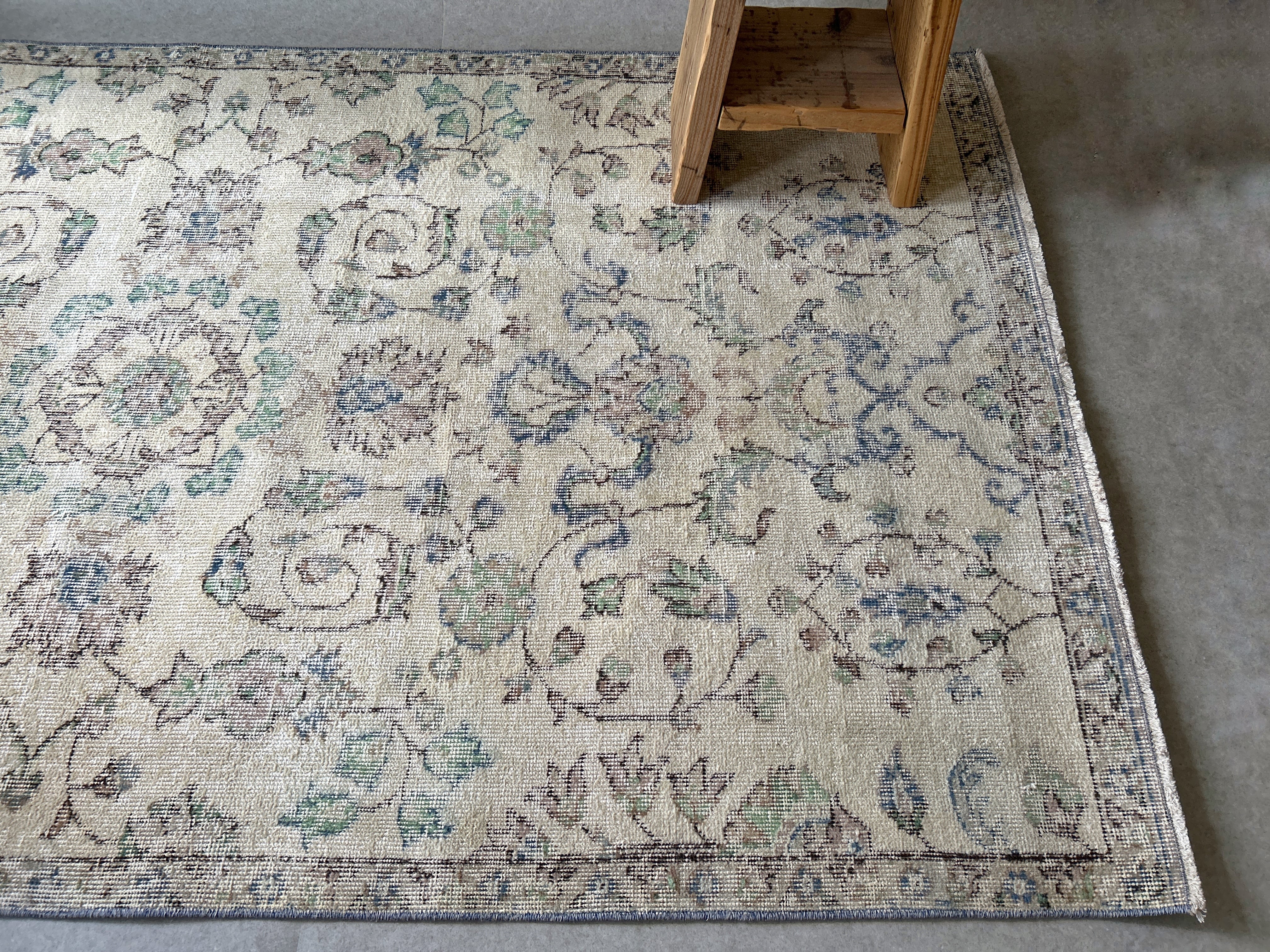 ナチュラルベージュのベースカラーにグリーンやブルーが少しアクセントになった、すっきりした花模様が洗練された印象のラグです。