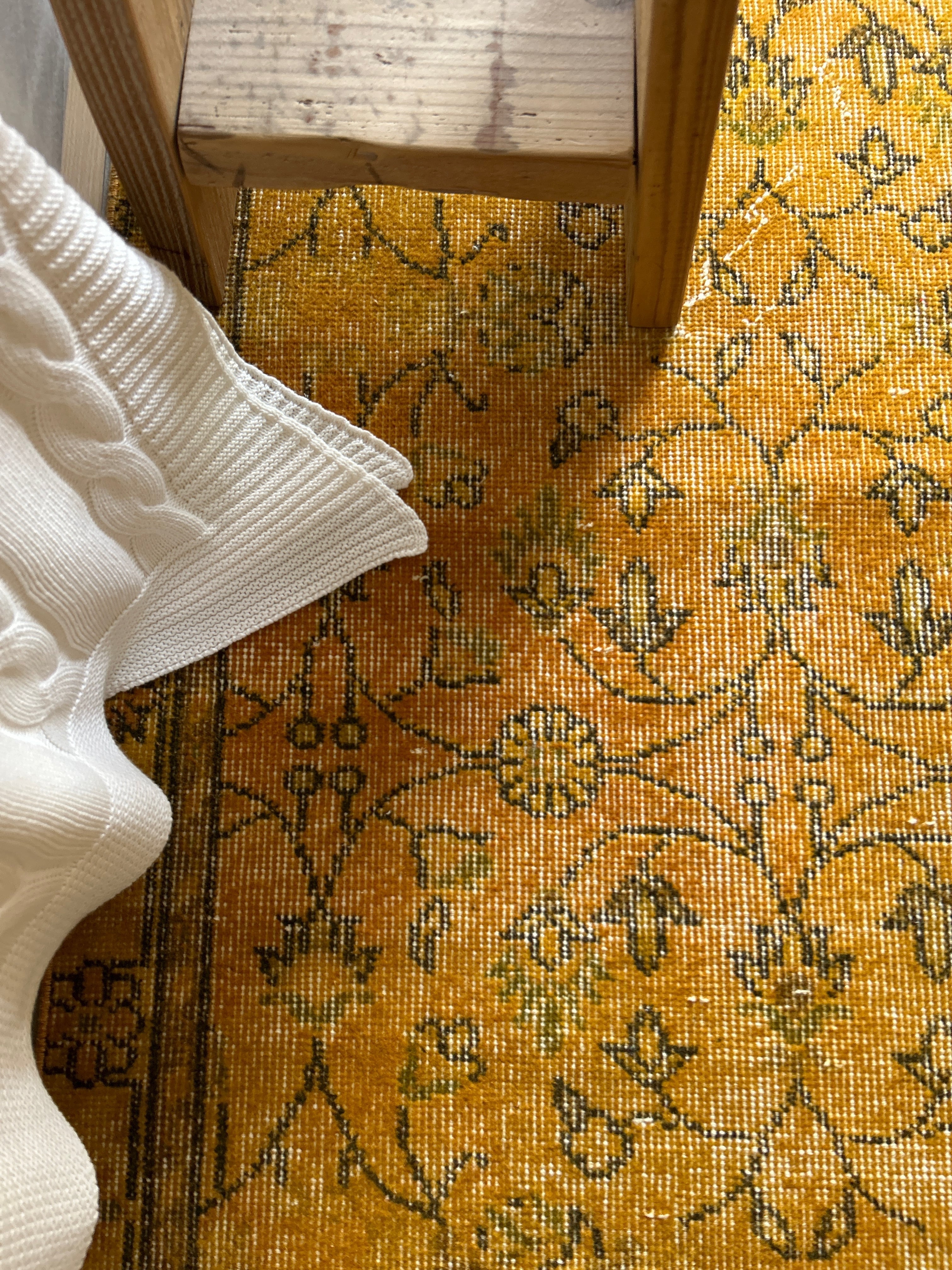 もともとは違う色だったラグをイエローで後染めしたものです。