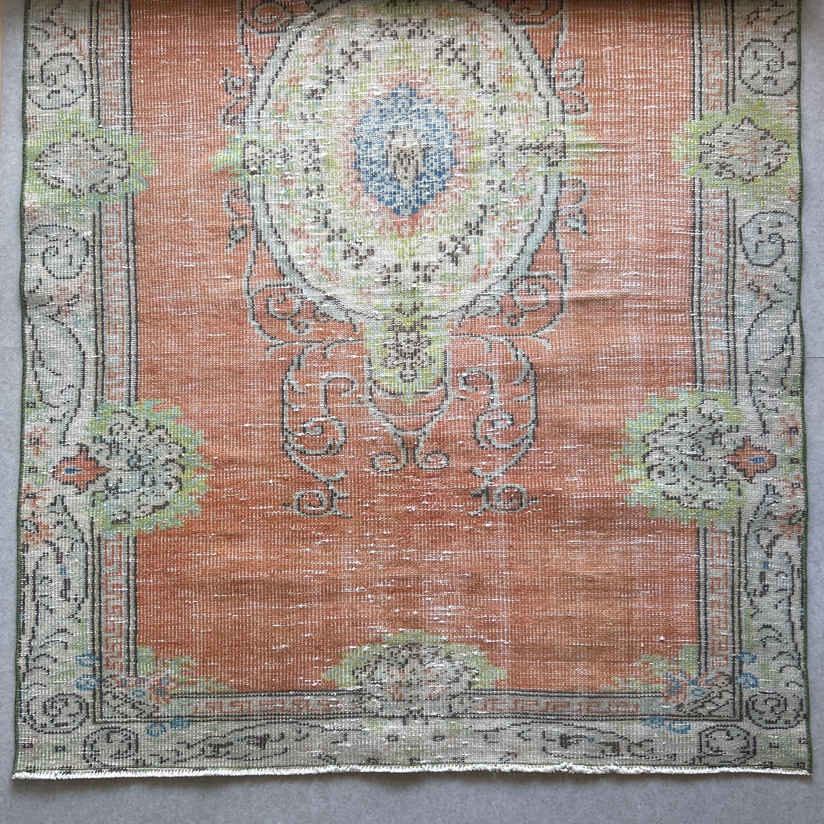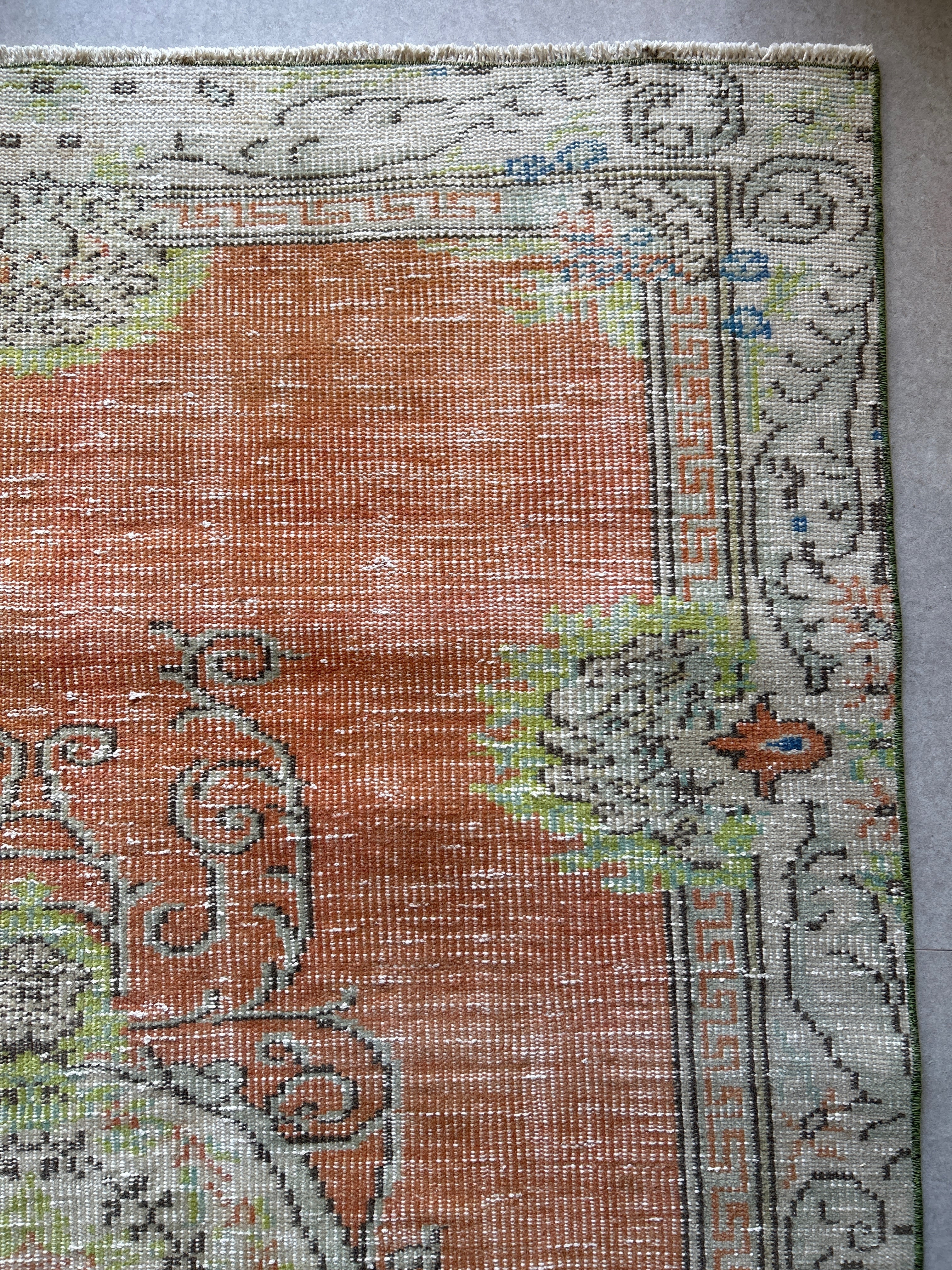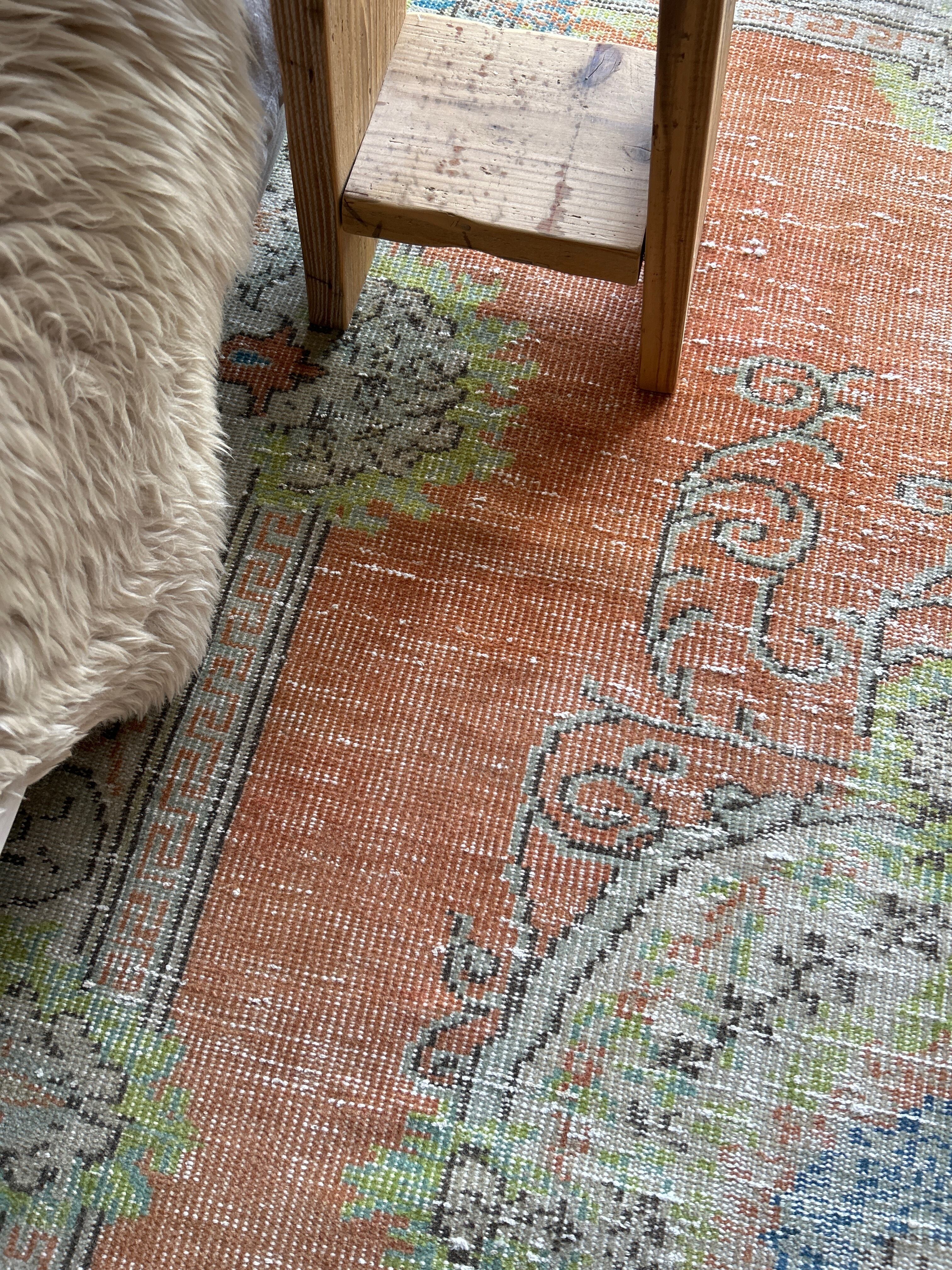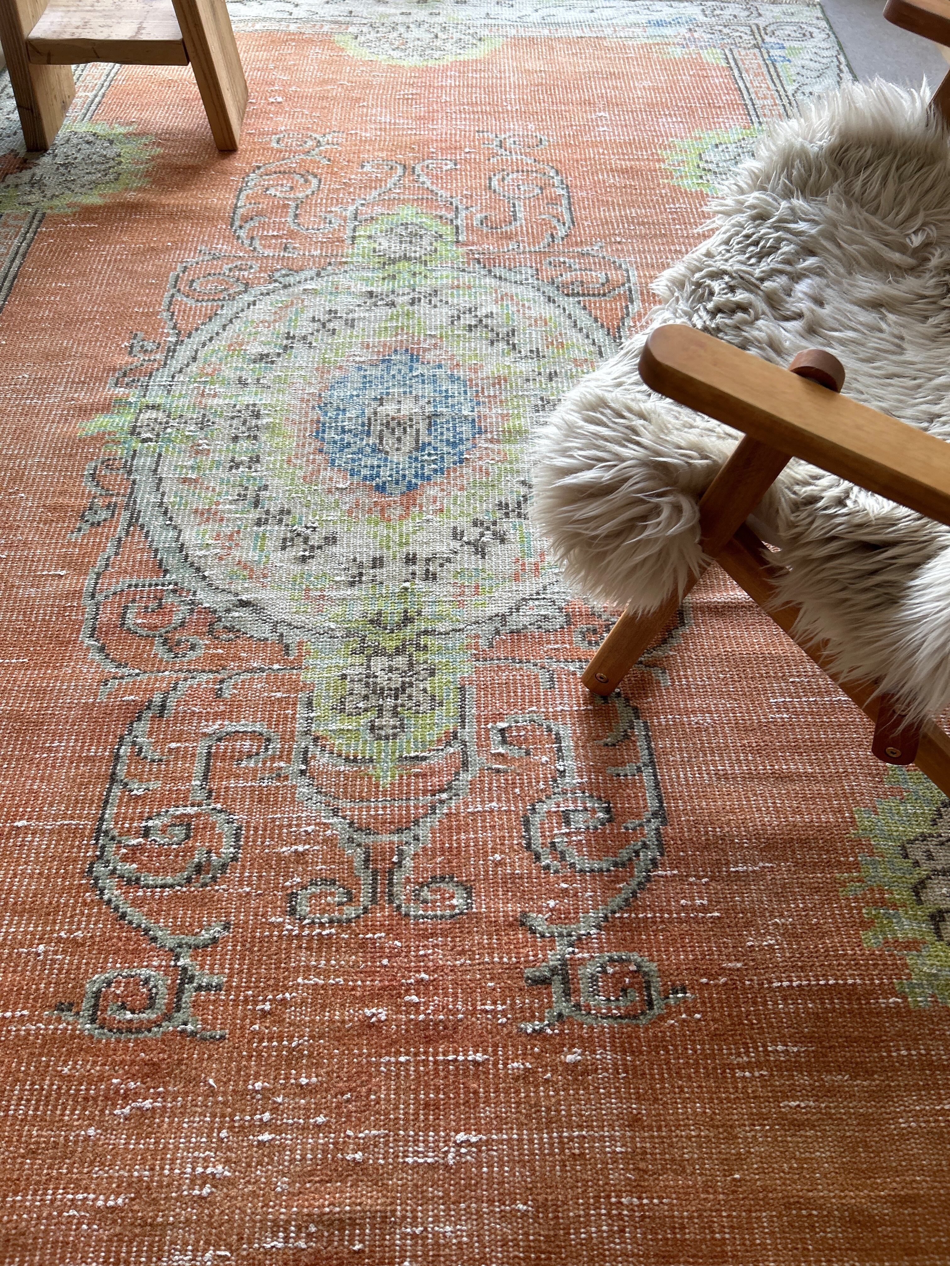 褪せたオレンジ系のベースカラーにライムグリーンやブルーのアクセントカラー、温かみがありながらどことなく爽やかな雰囲気も漂うかわいいラグ。