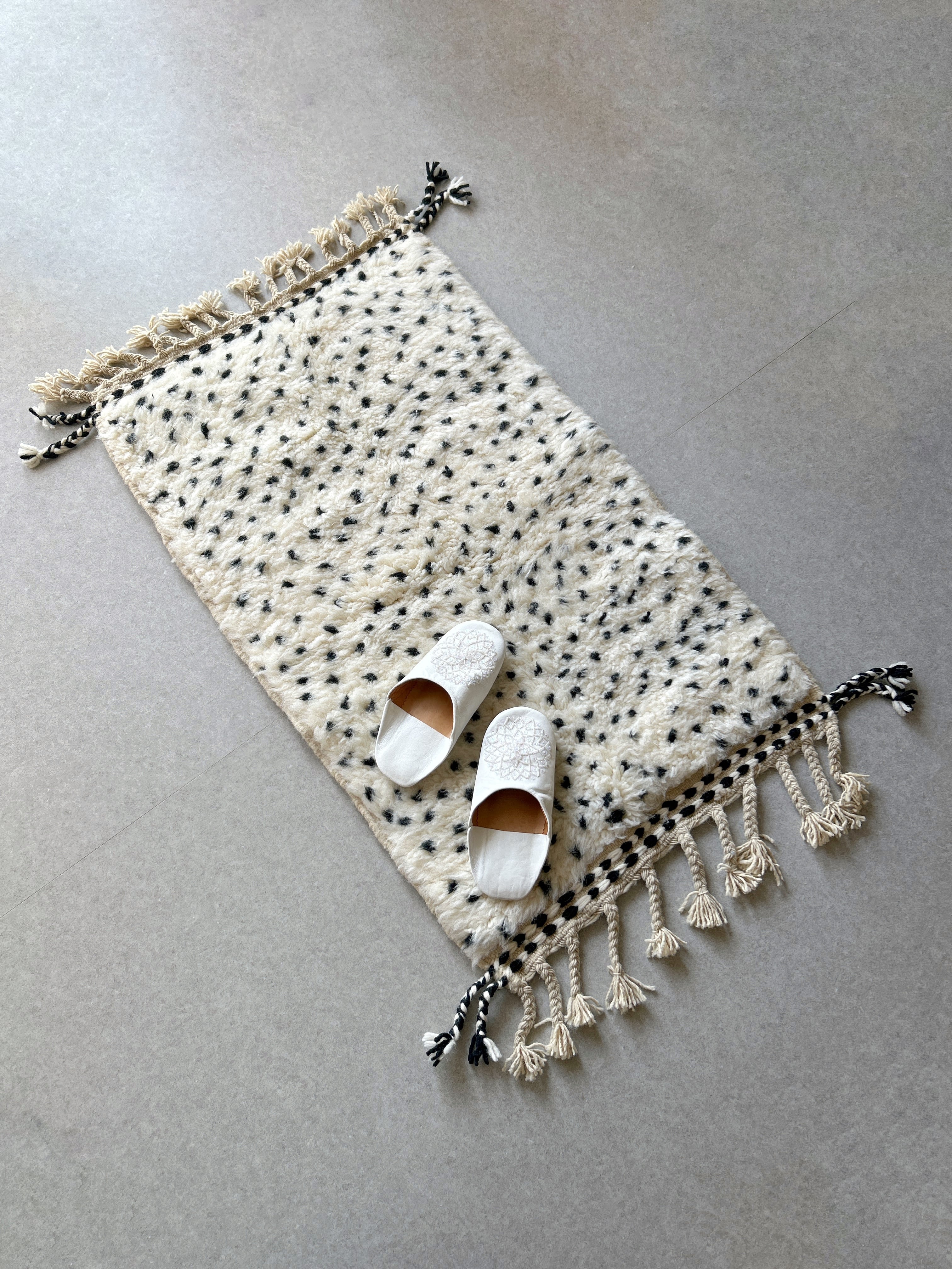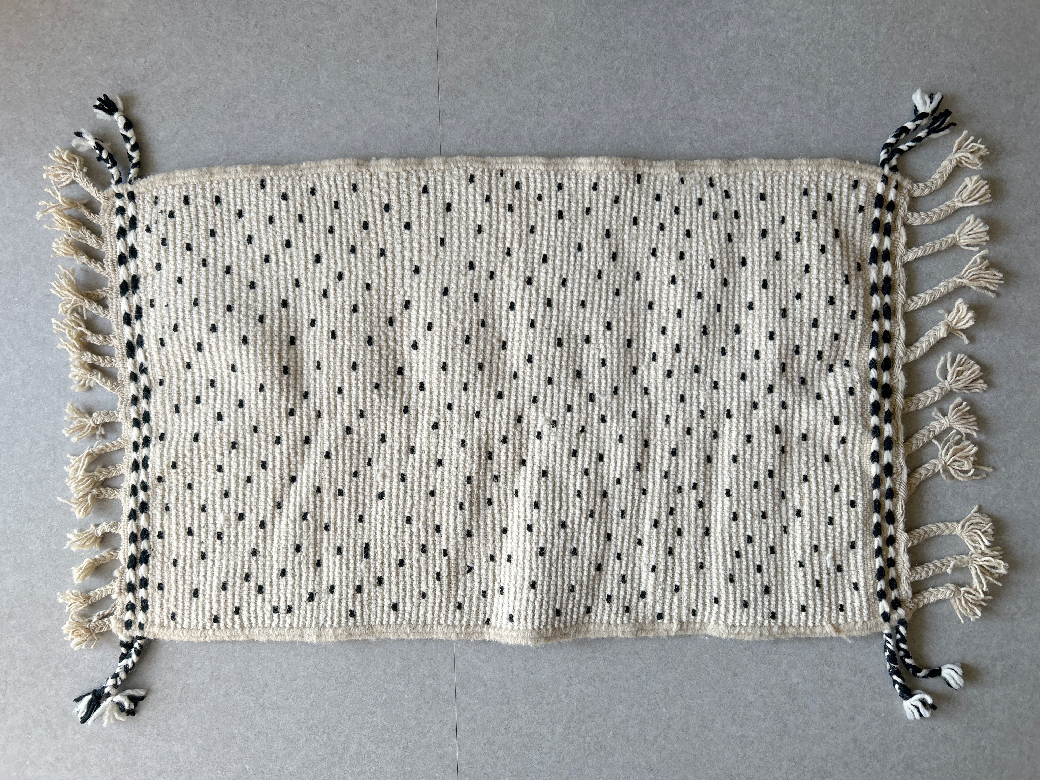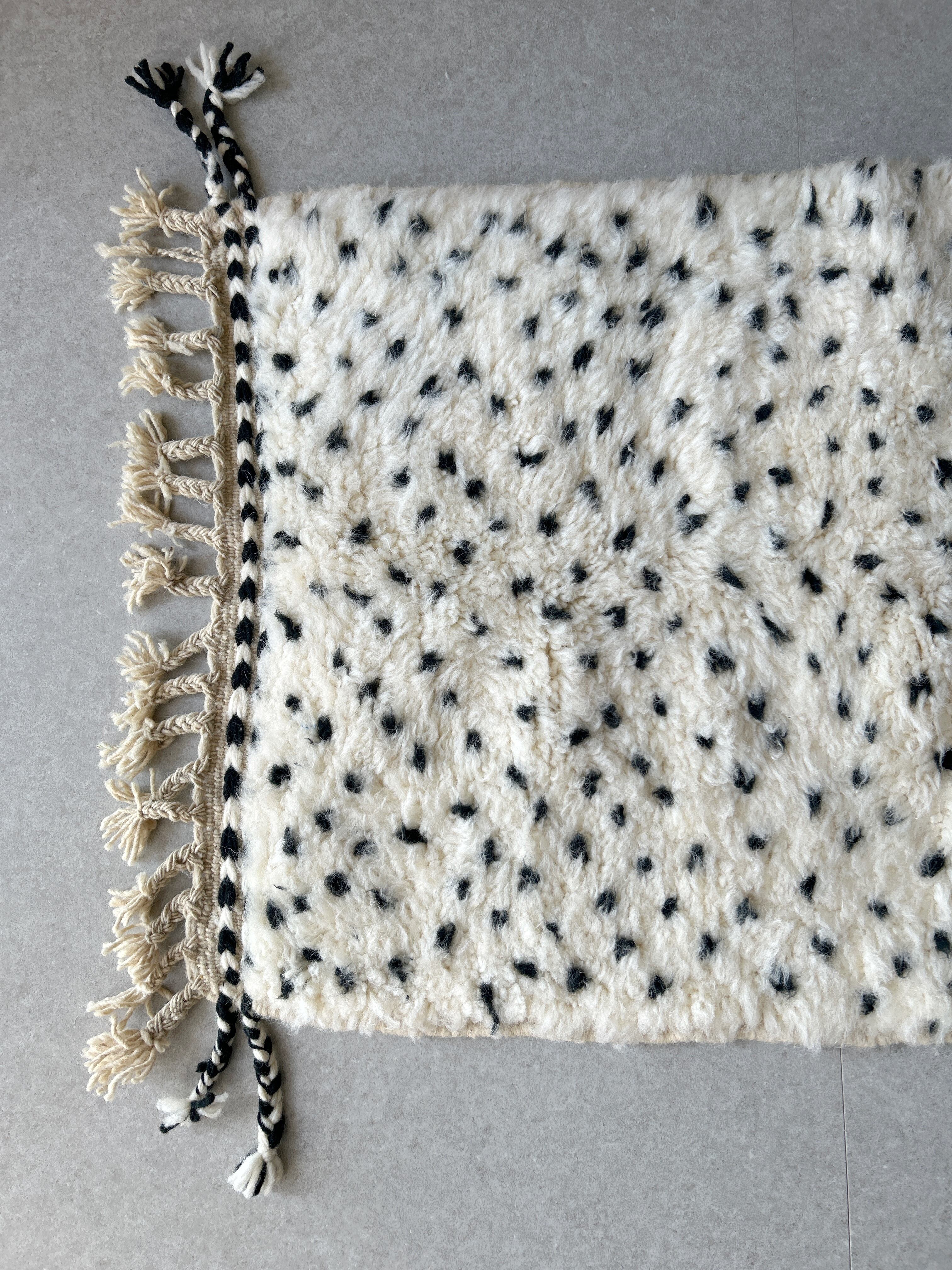ナチュラルなアイボリーに黒のドット模様のモロッコラグ。