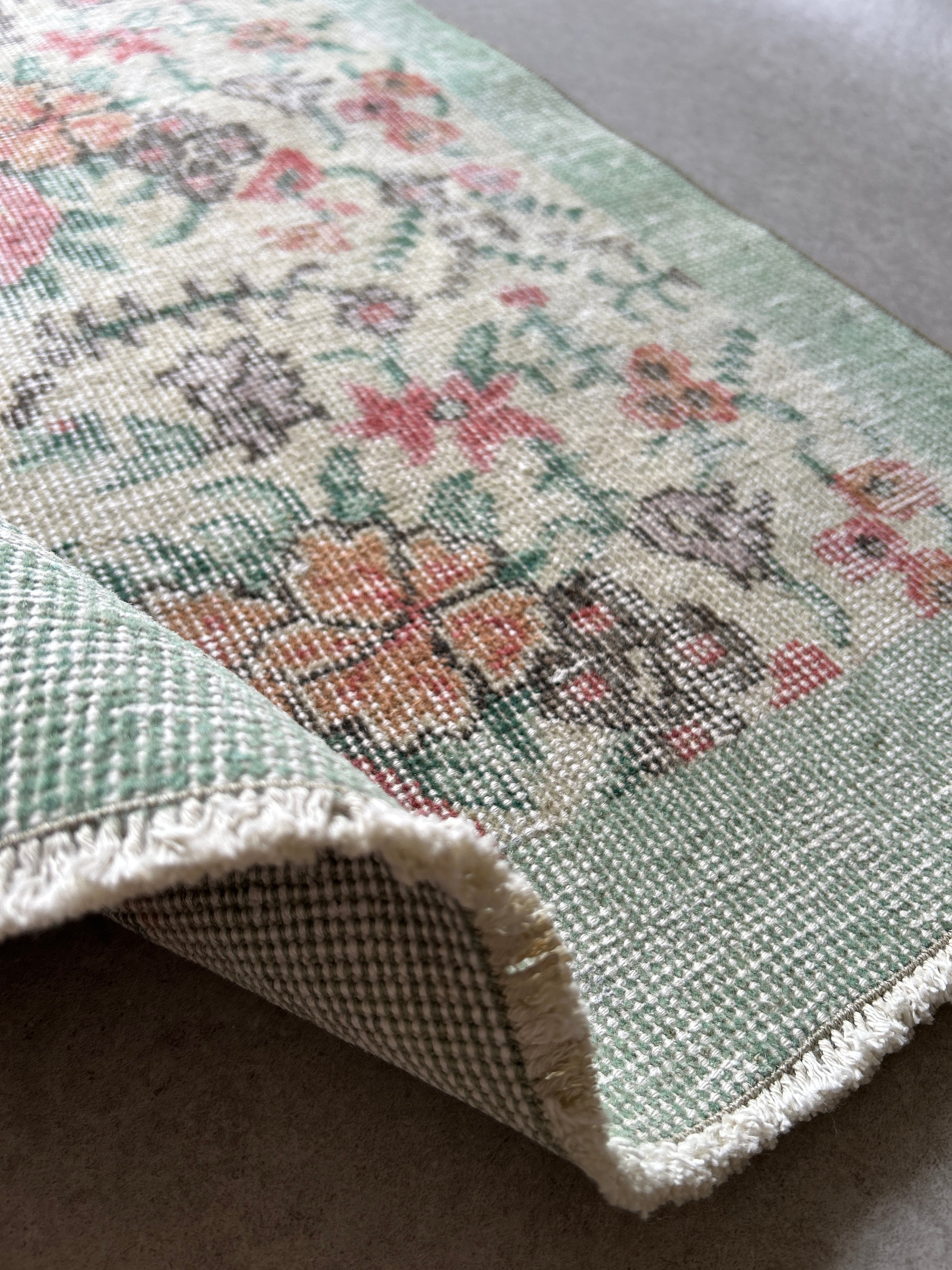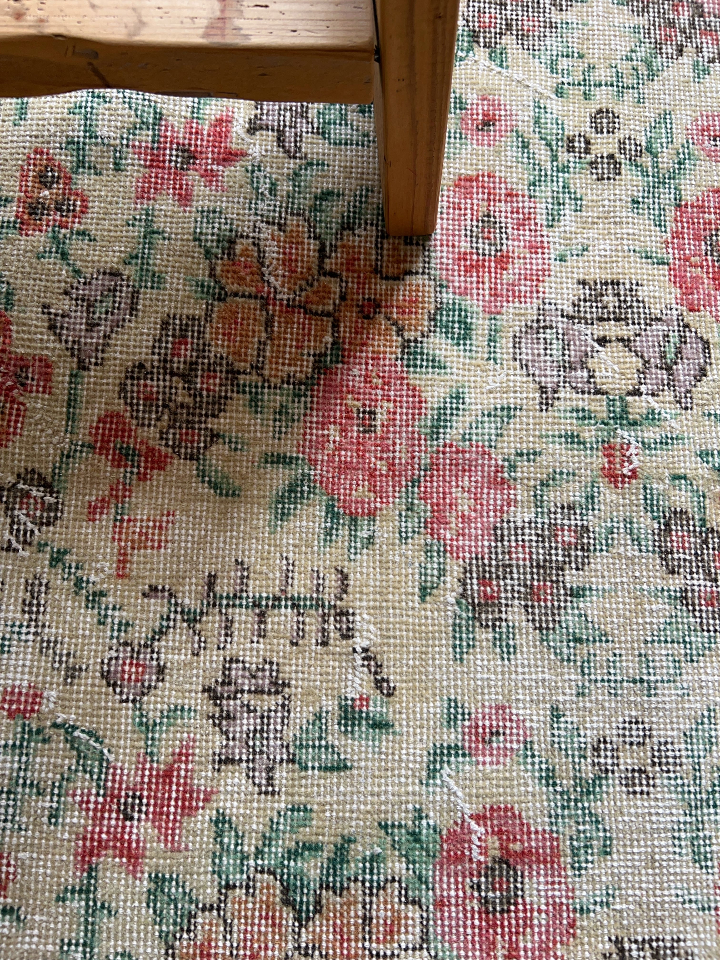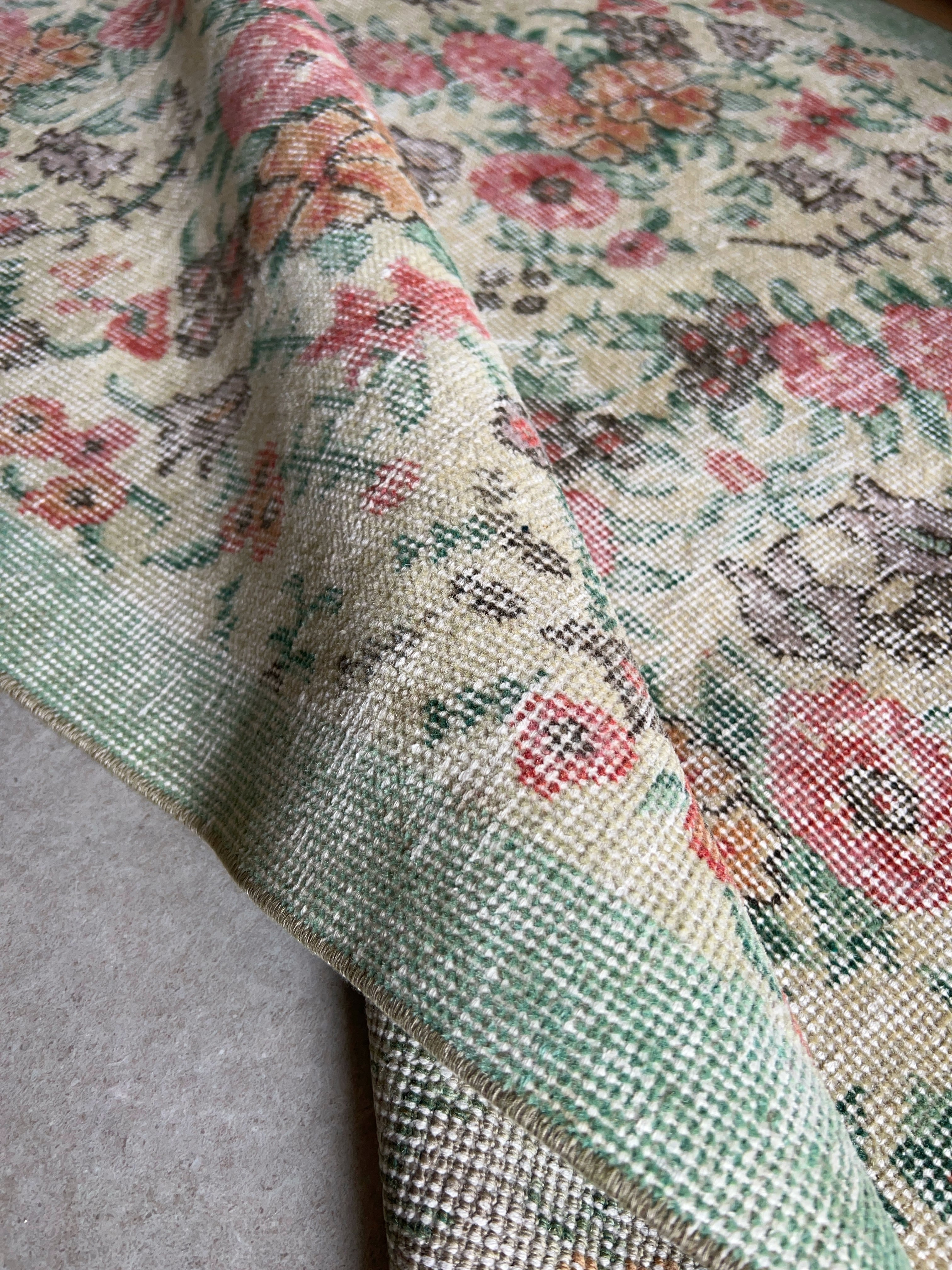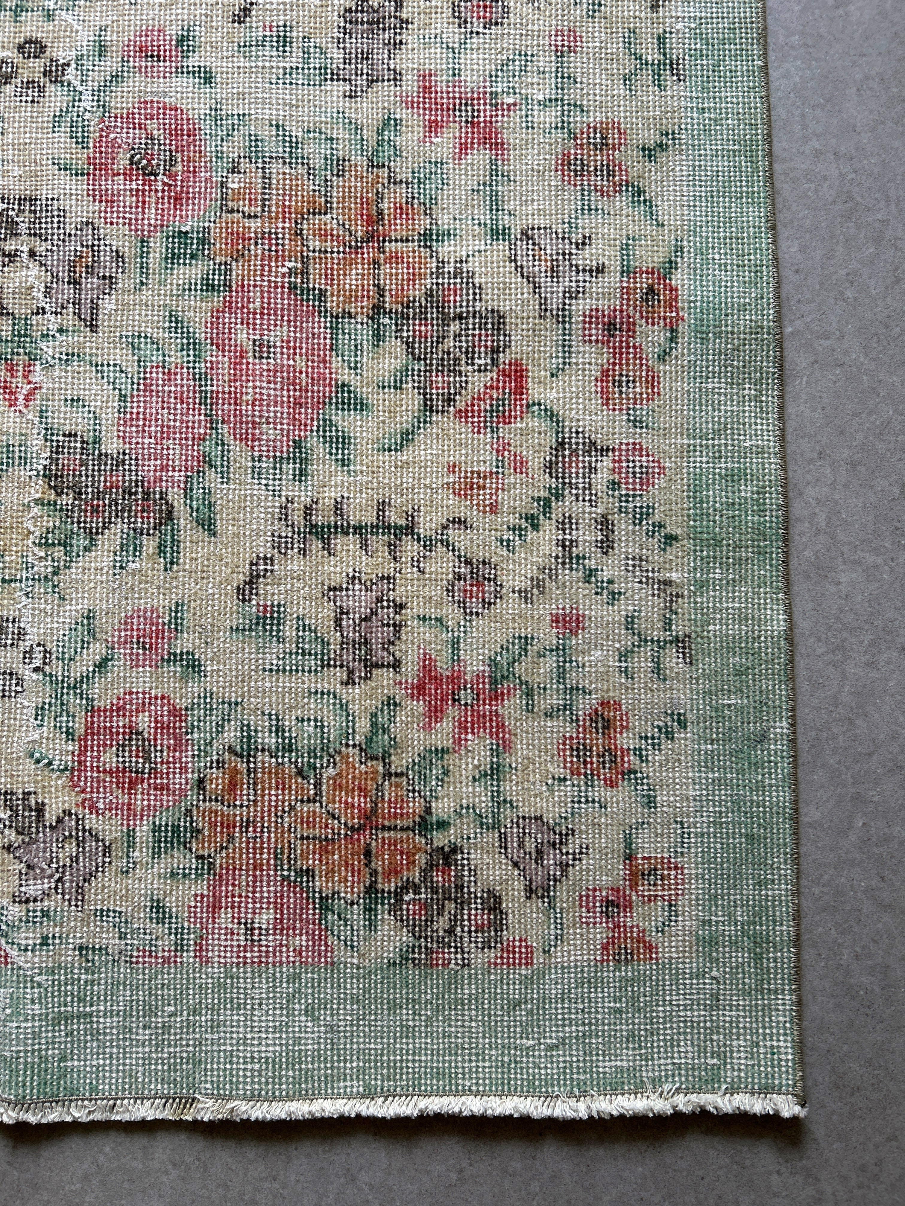 ナチュラルアイボリーのベースに赤やオレンジ色のブーケのような花柄がとてもかわいいラグです。全体的に入ったかすれの白と淡いペールトーンの色味は優しい印象で春の気分にもぴったりです。