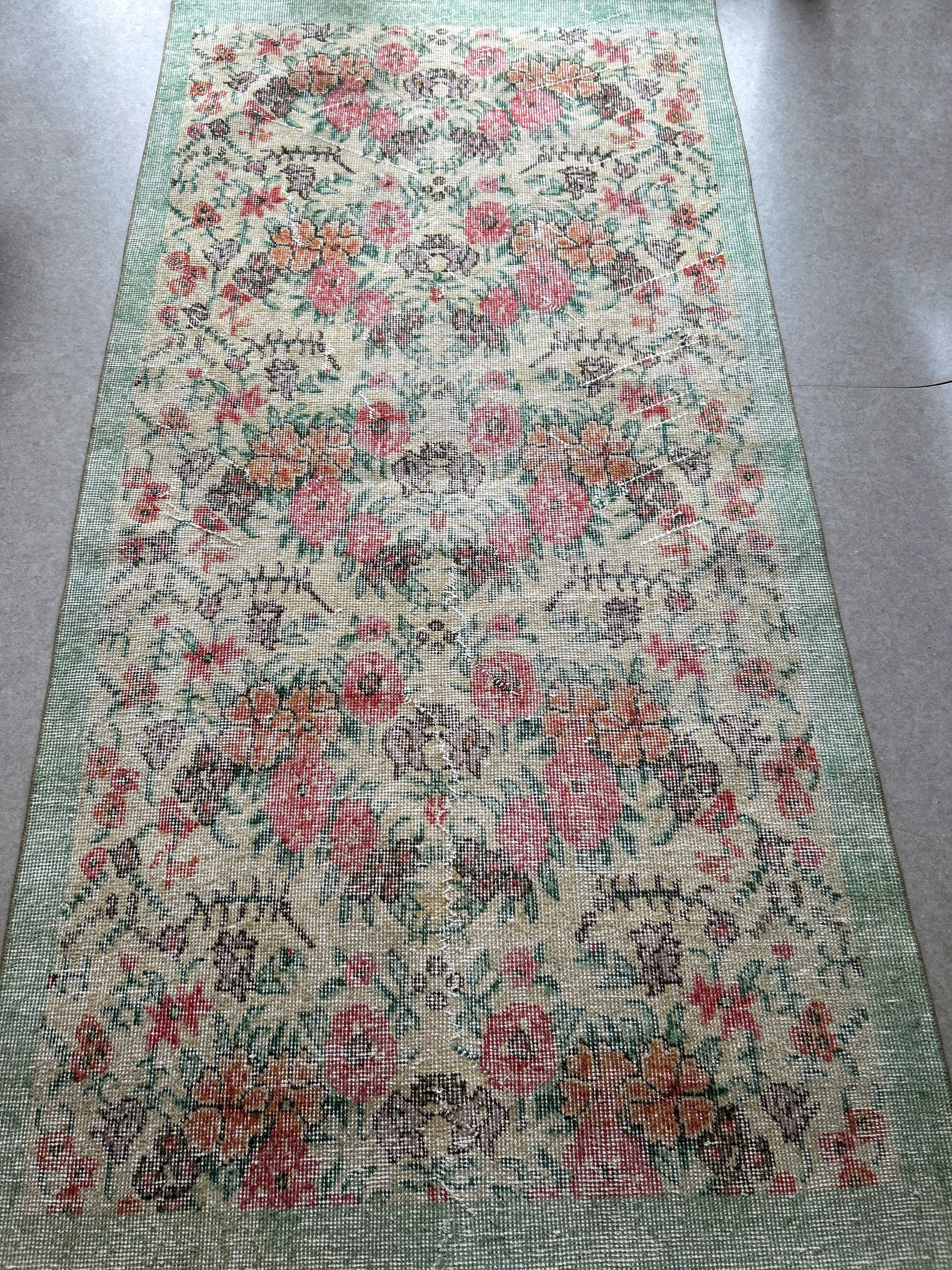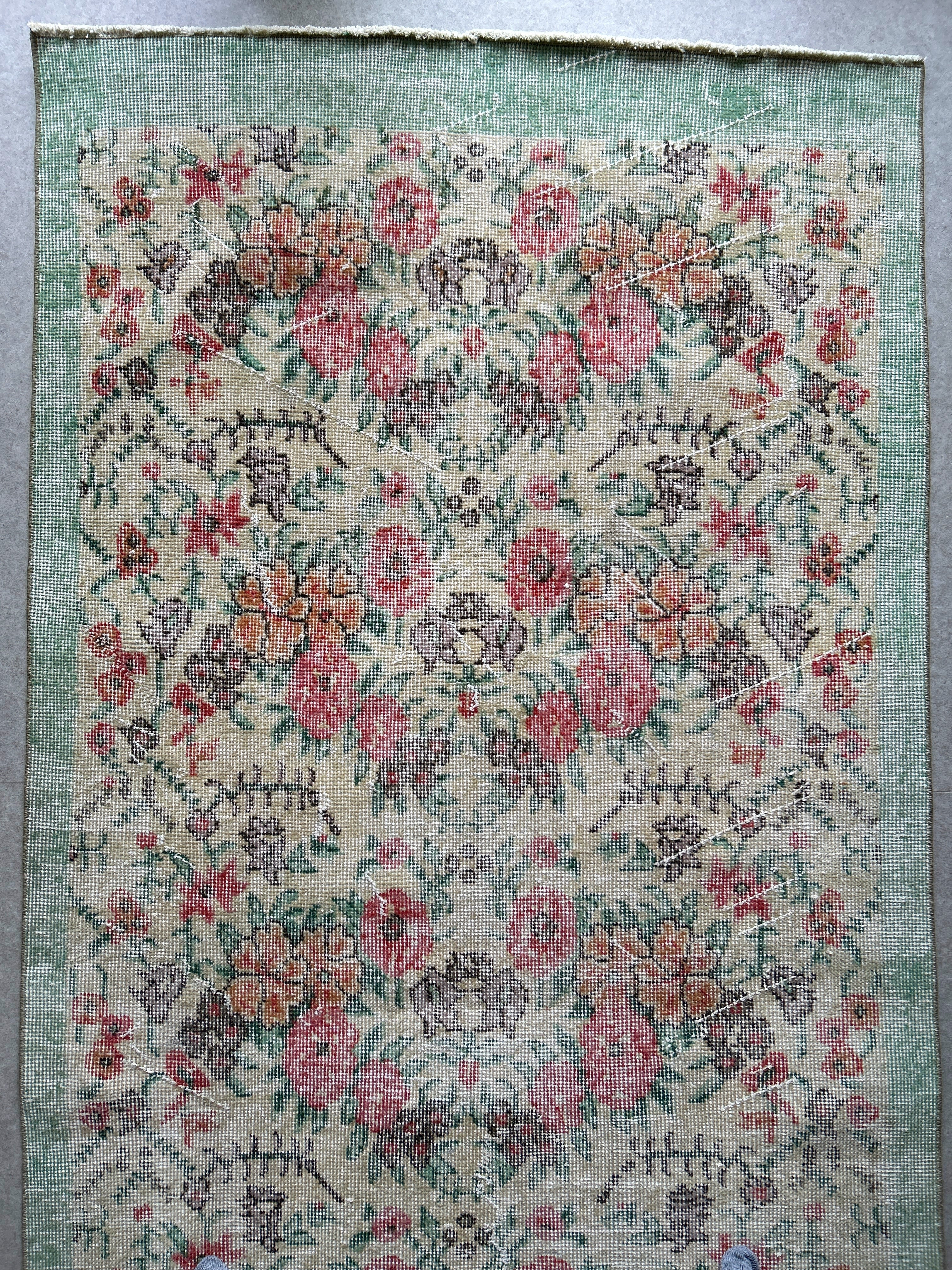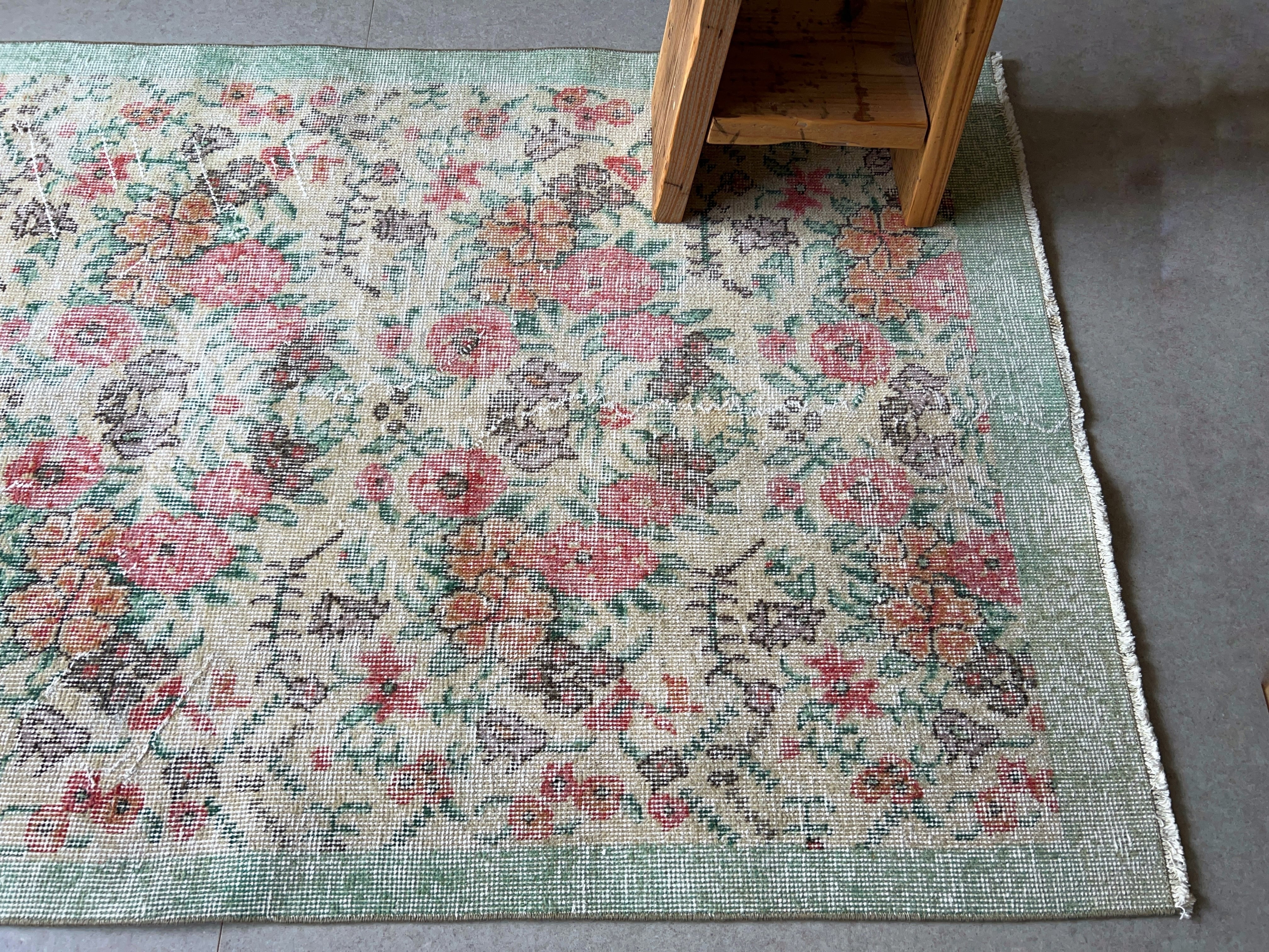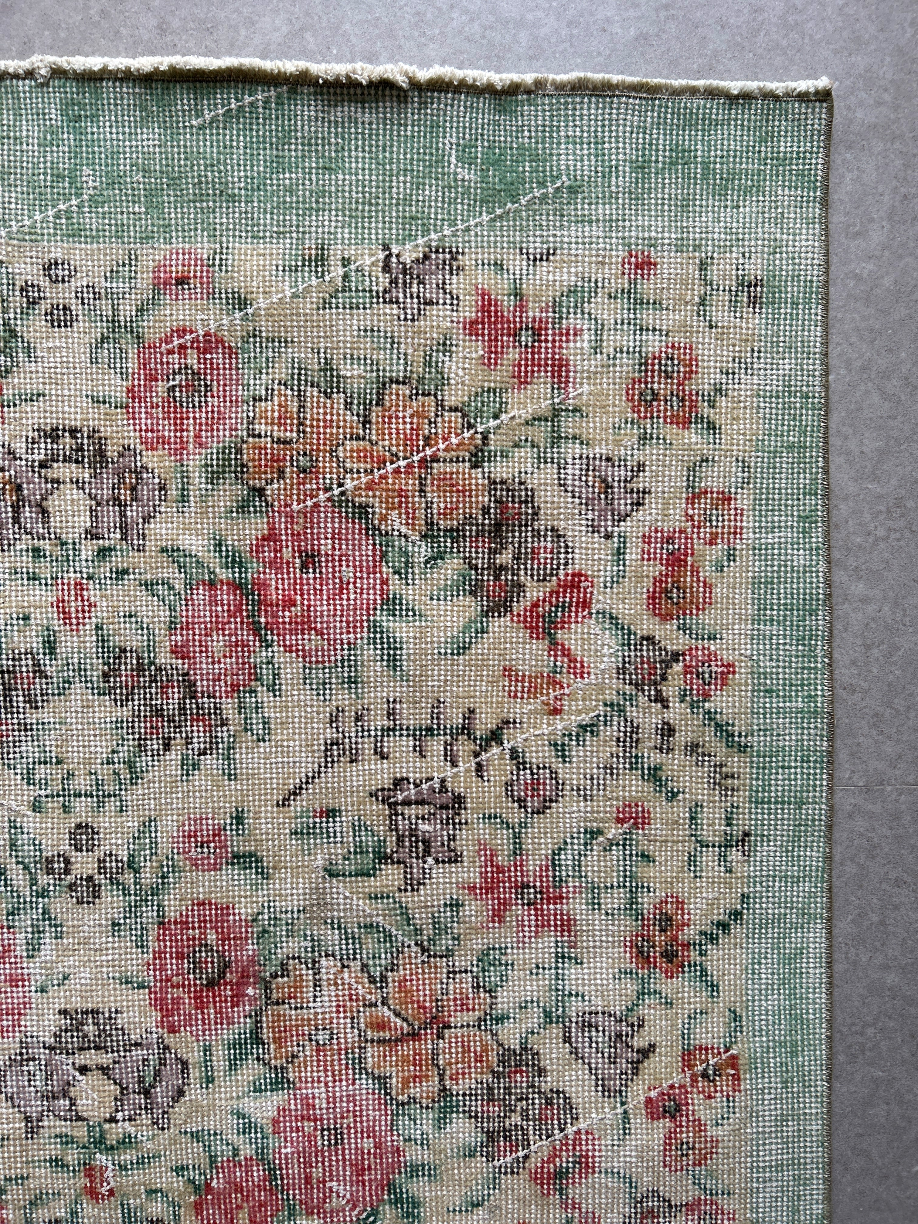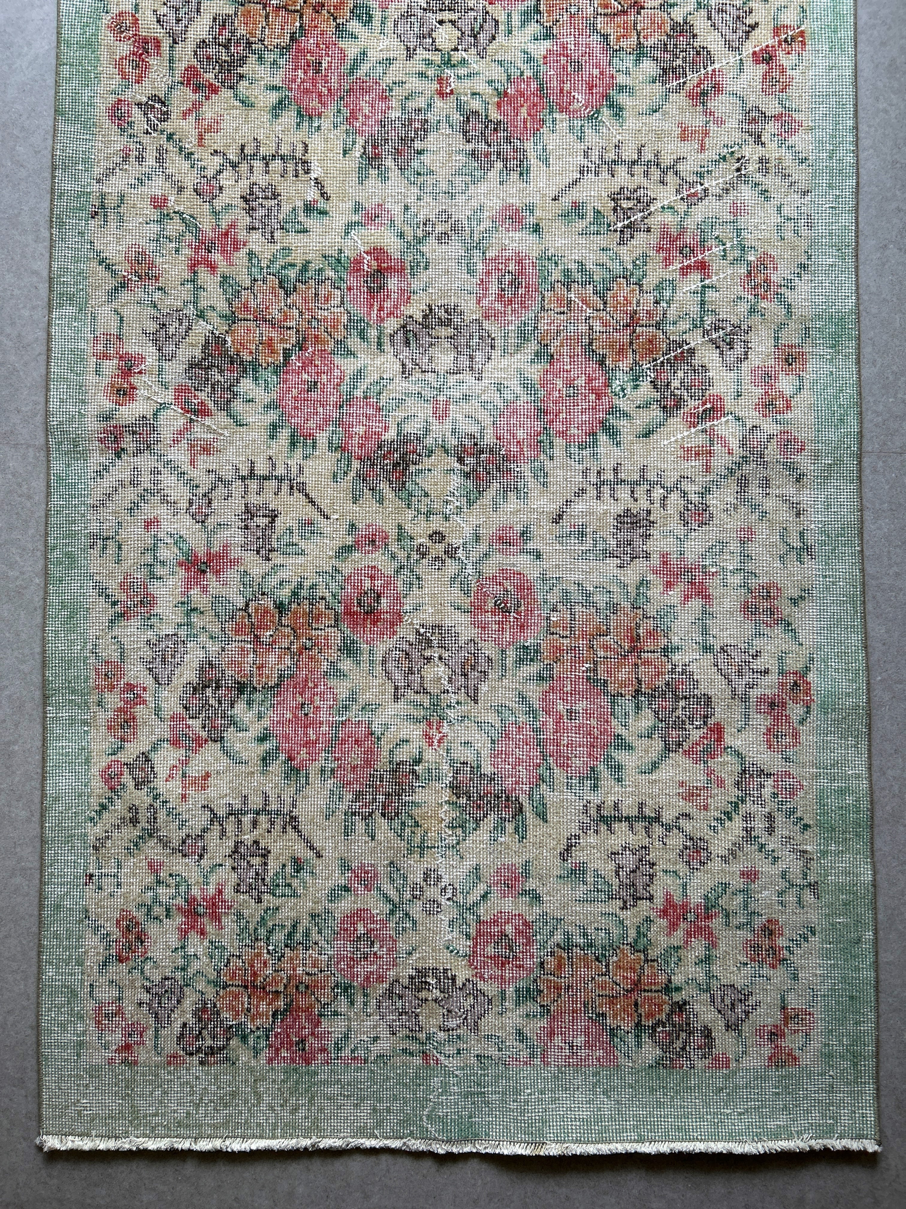 ナチュラルアイボリーのベースに赤やオレンジ色のブーケのような花柄がとてもかわいいラグです。全体的に入ったかすれの白と淡いペールトーンの色味は優しい印象で春の気分にもぴったりです。