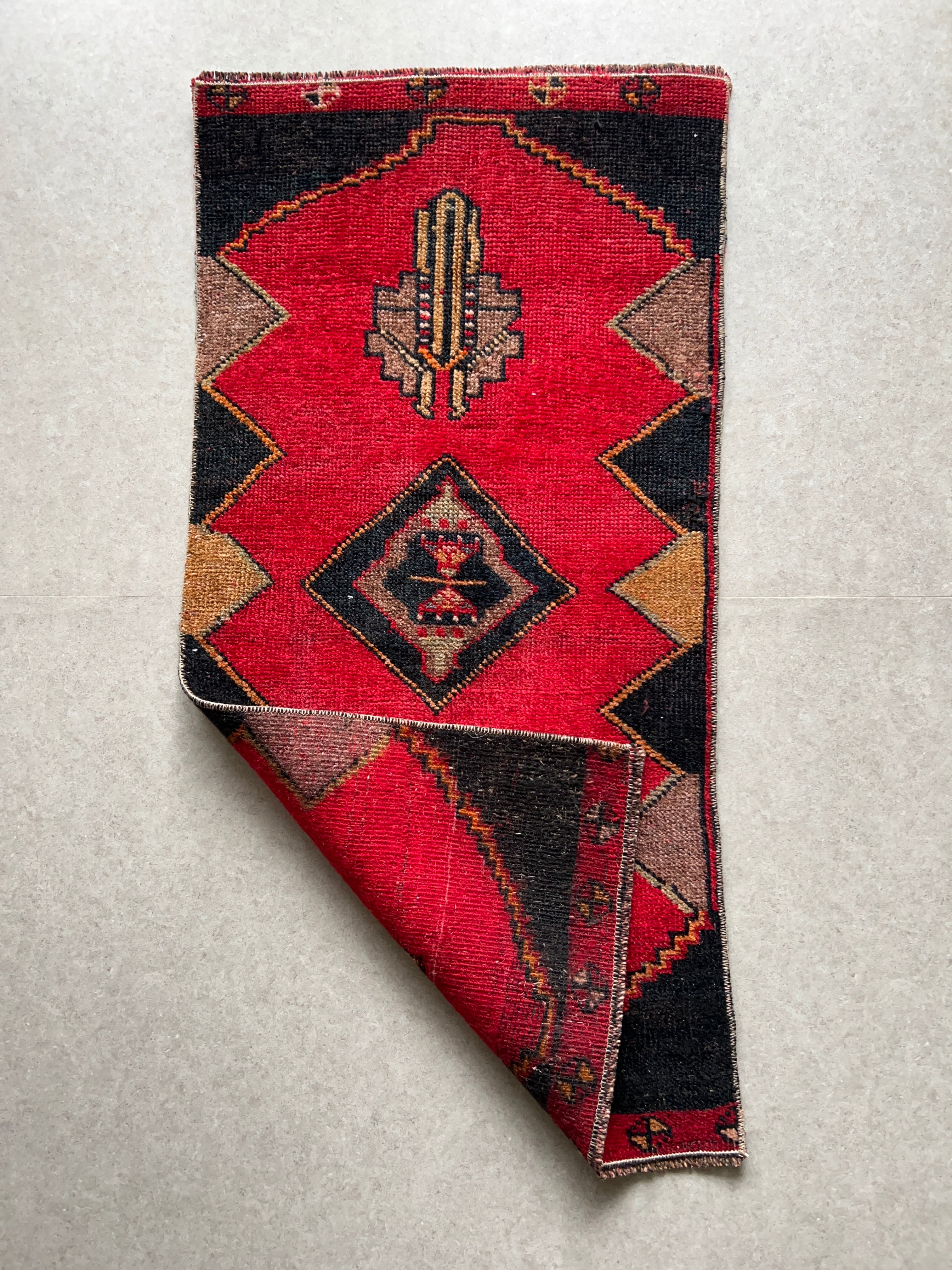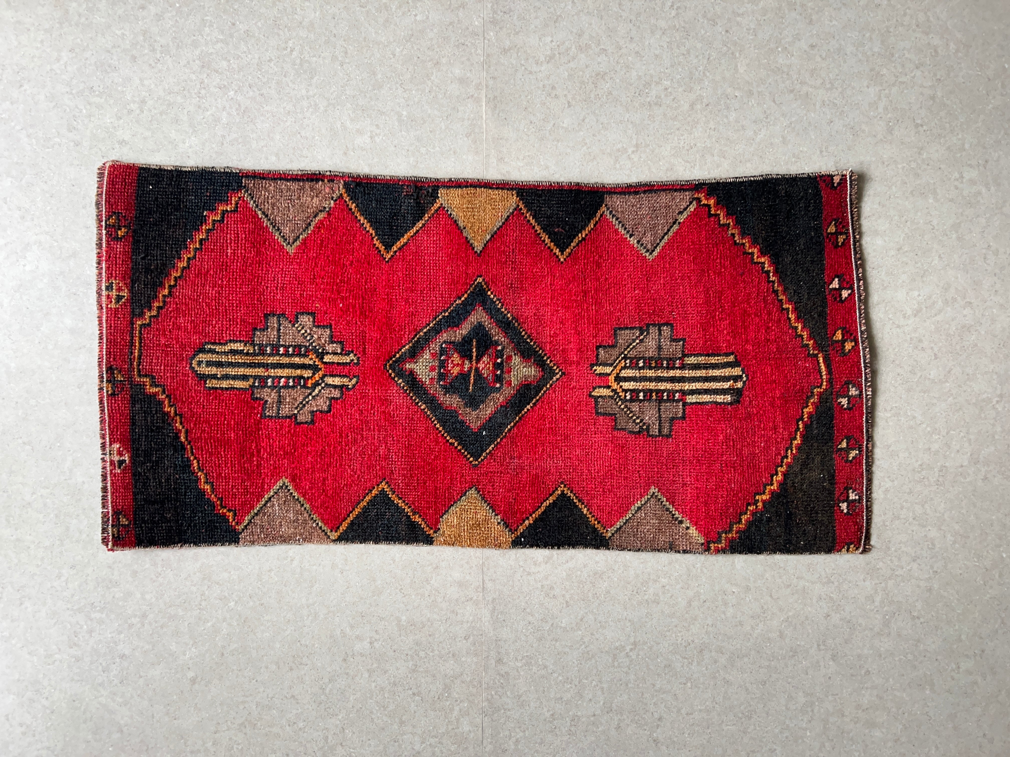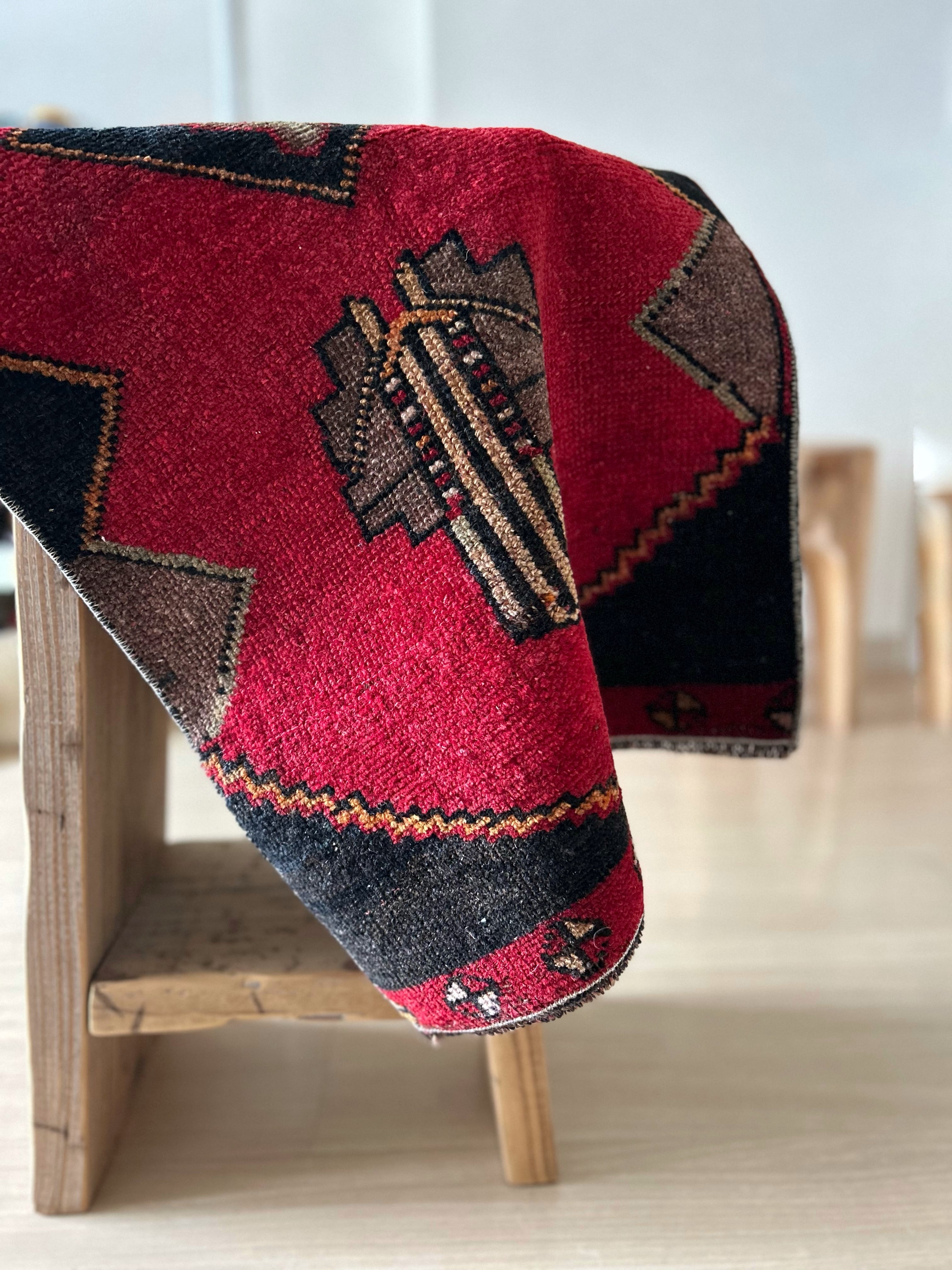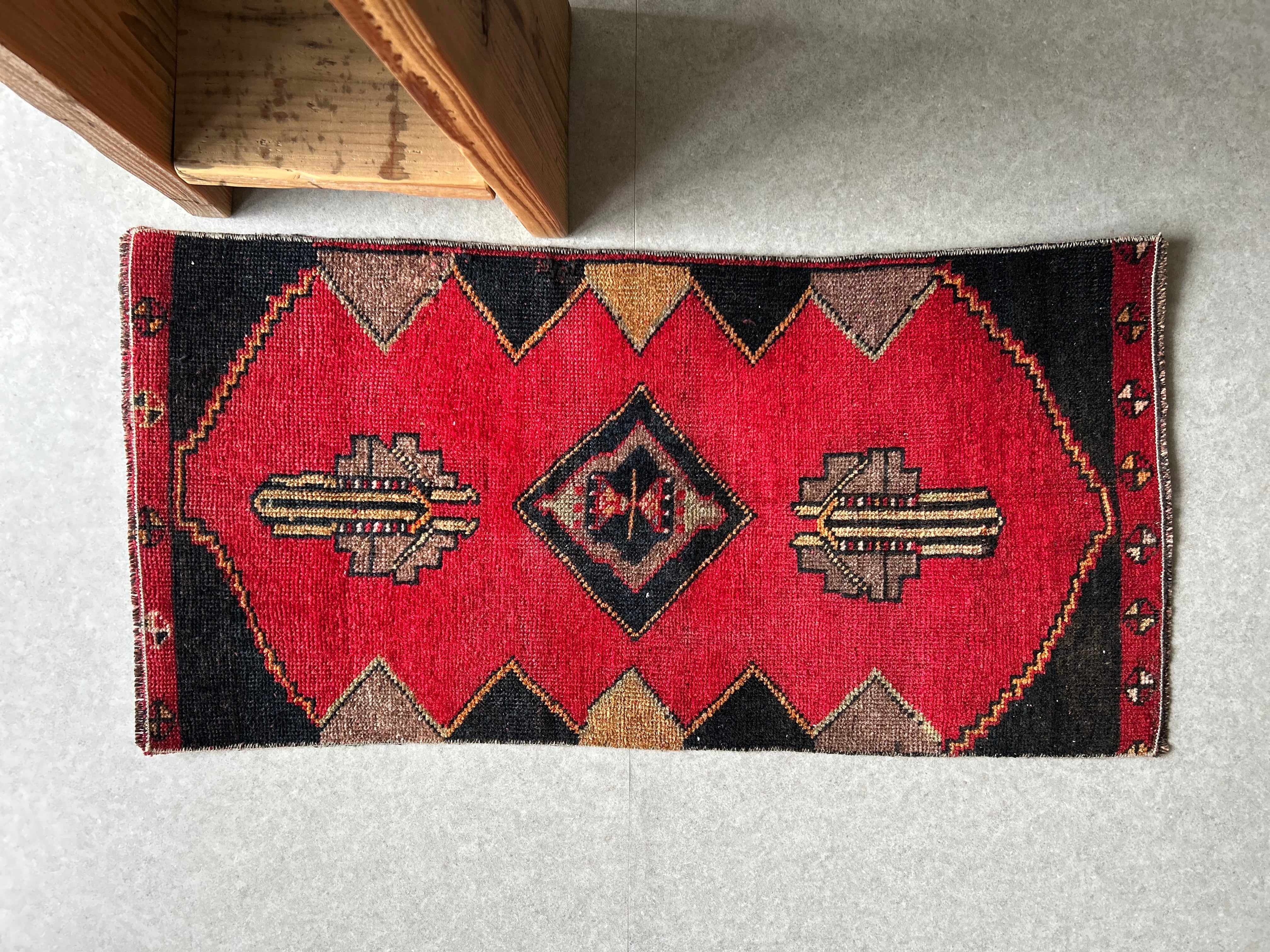 深いトライバルレッドの色合いと独特な模様が魅力的なスモールラグです。