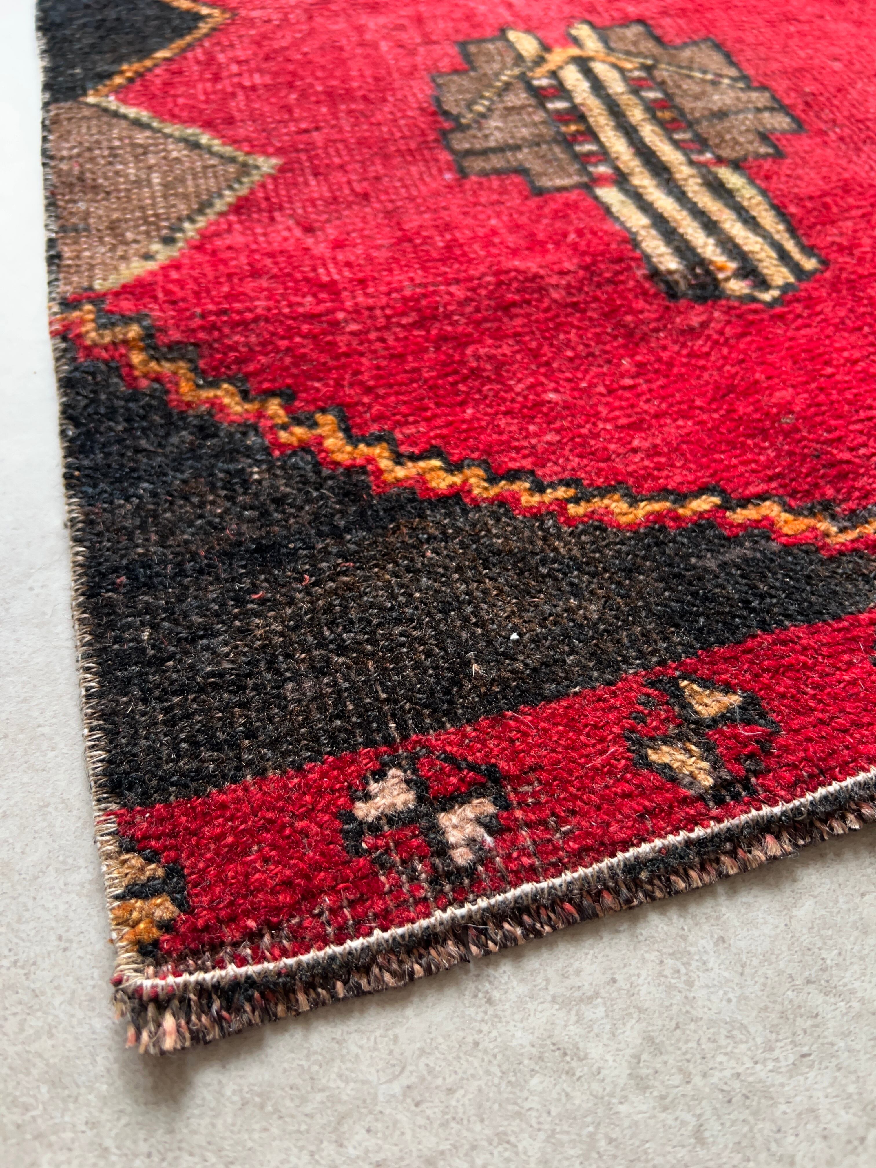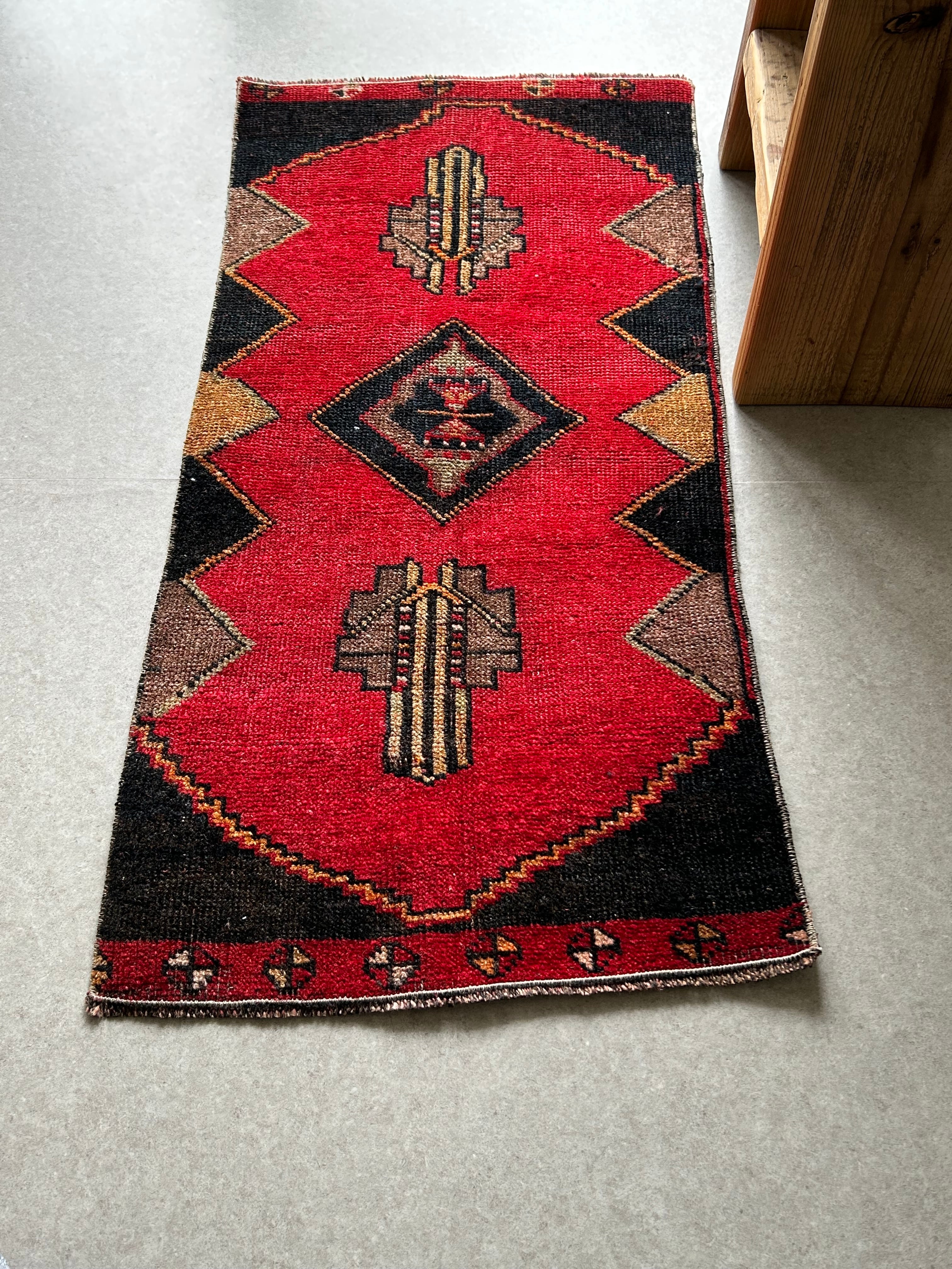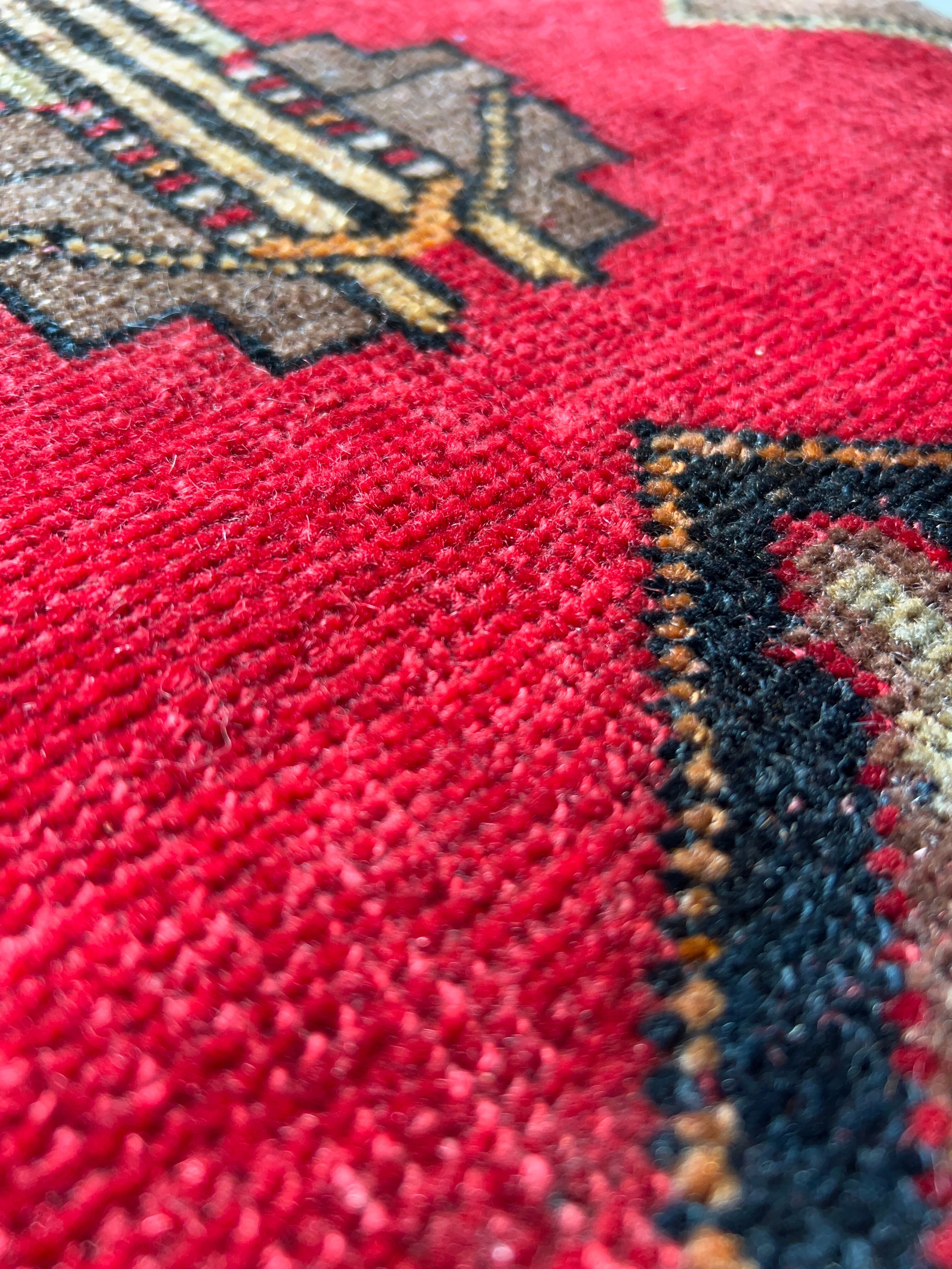 深いトライバルレッドの色合いと独特な模様が魅力的なスモールラグです。