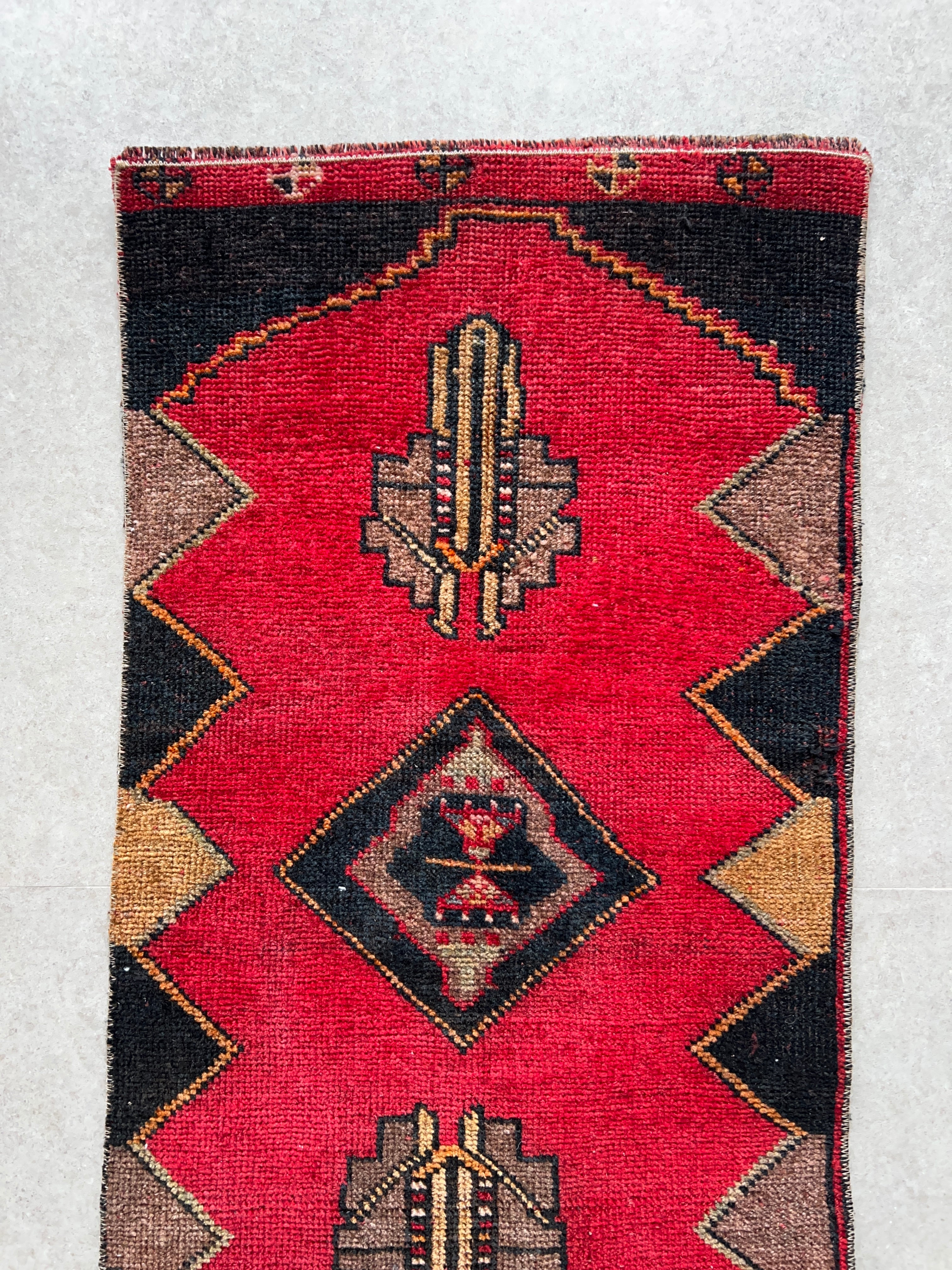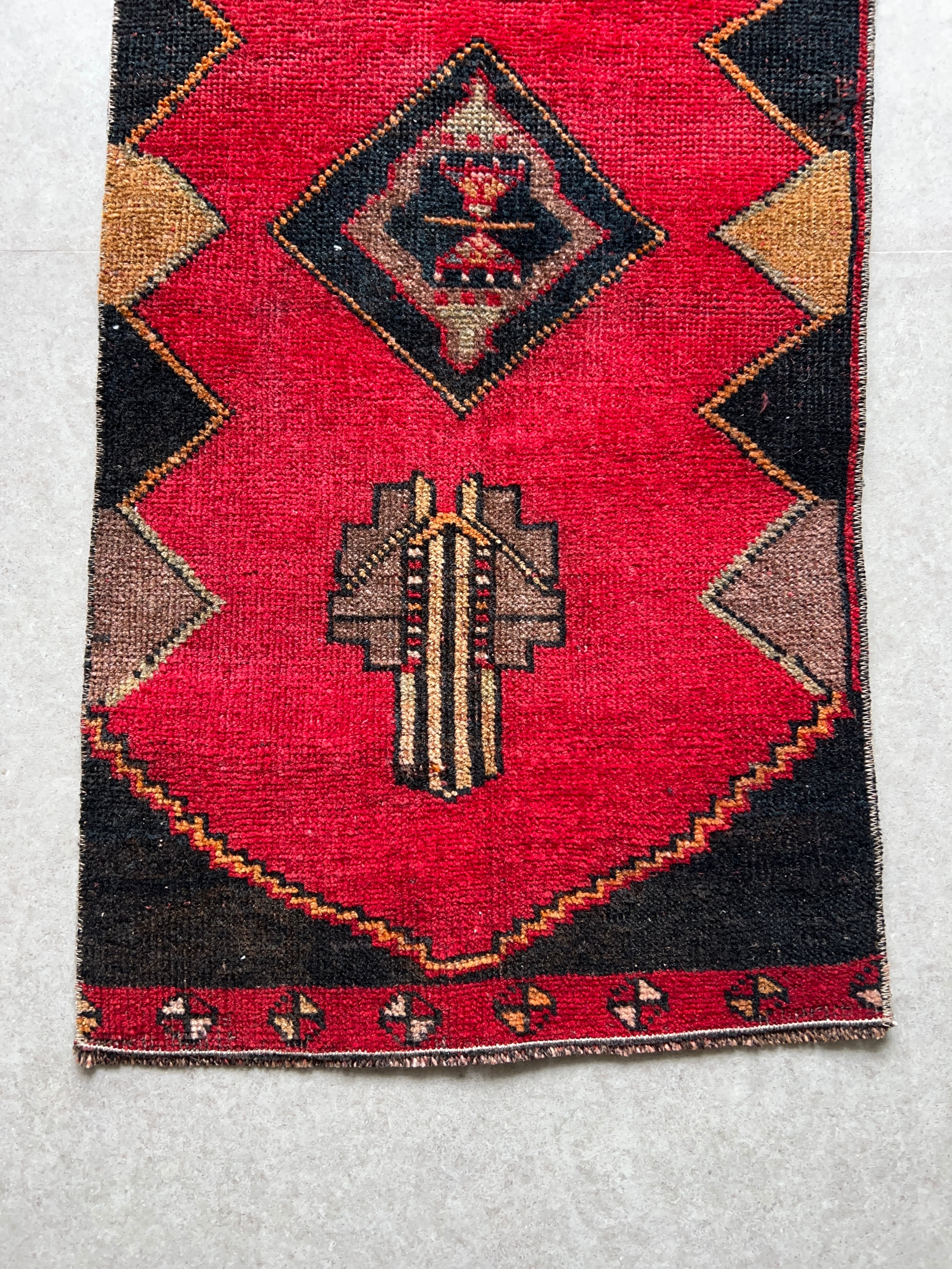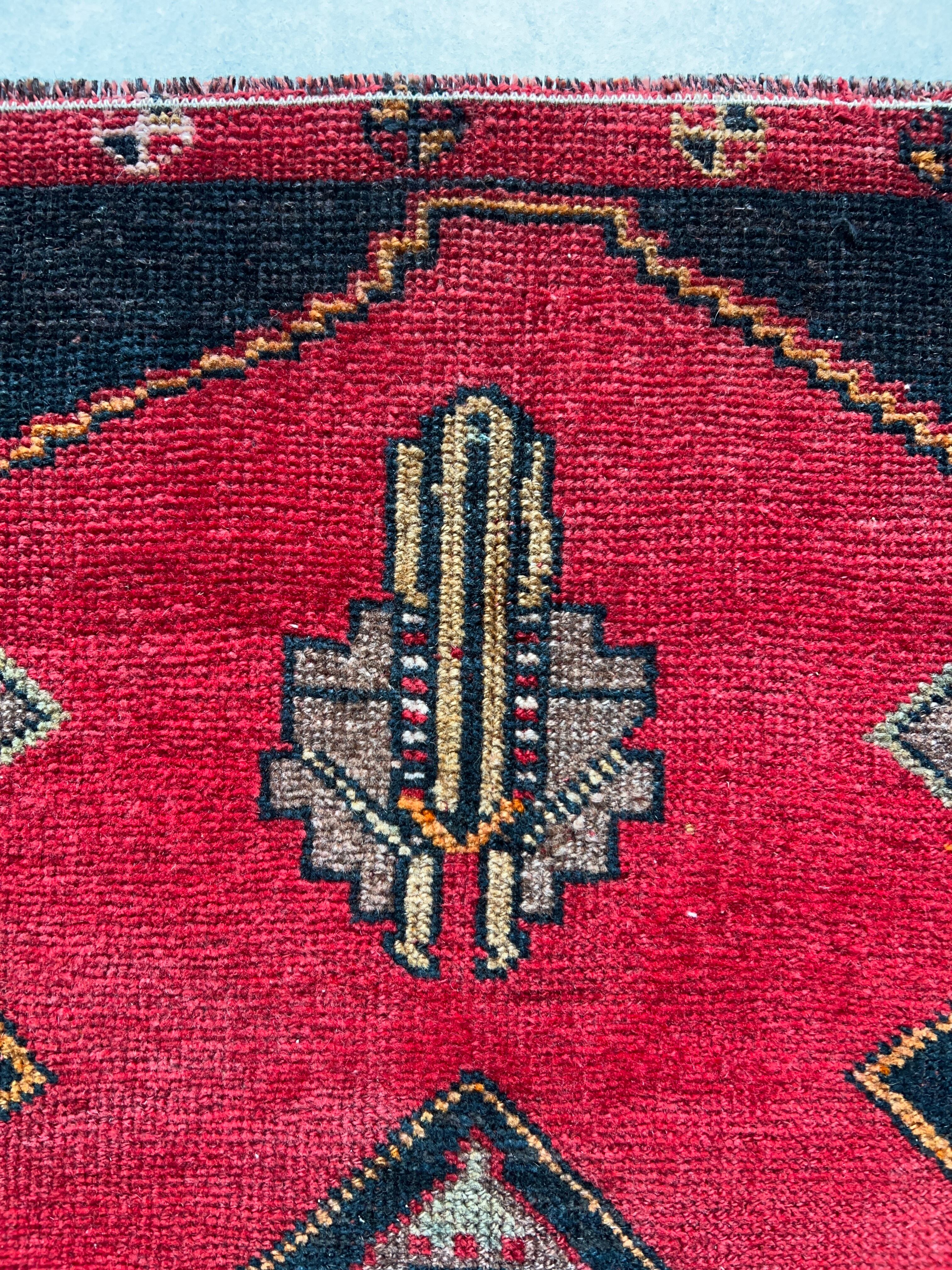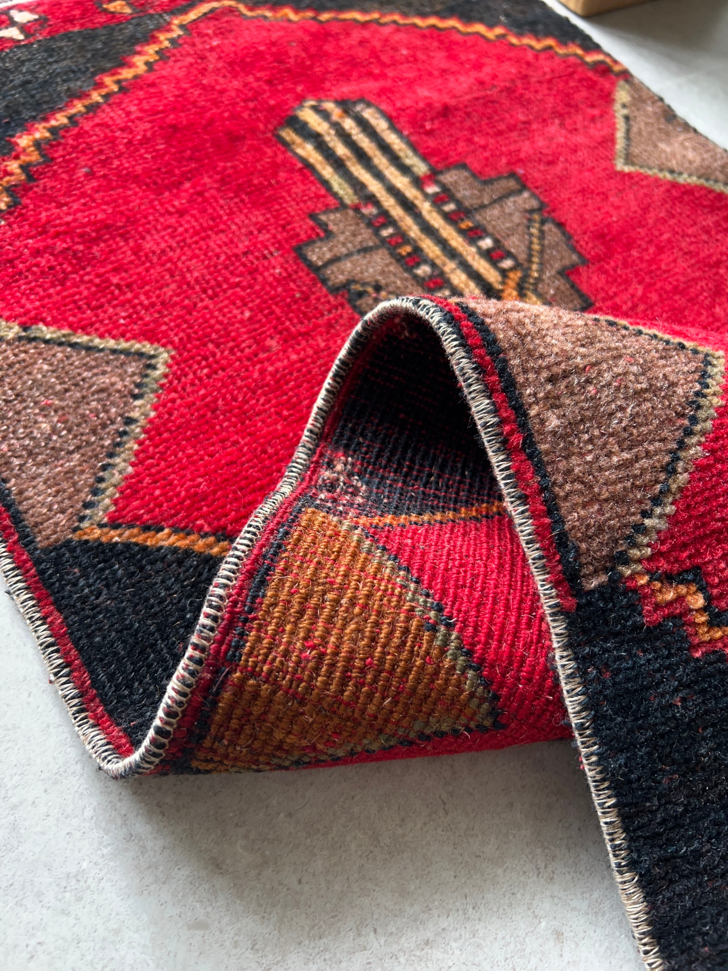 深いトライバルレッドの色合いと独特な模様が魅力的なスモールラグです。