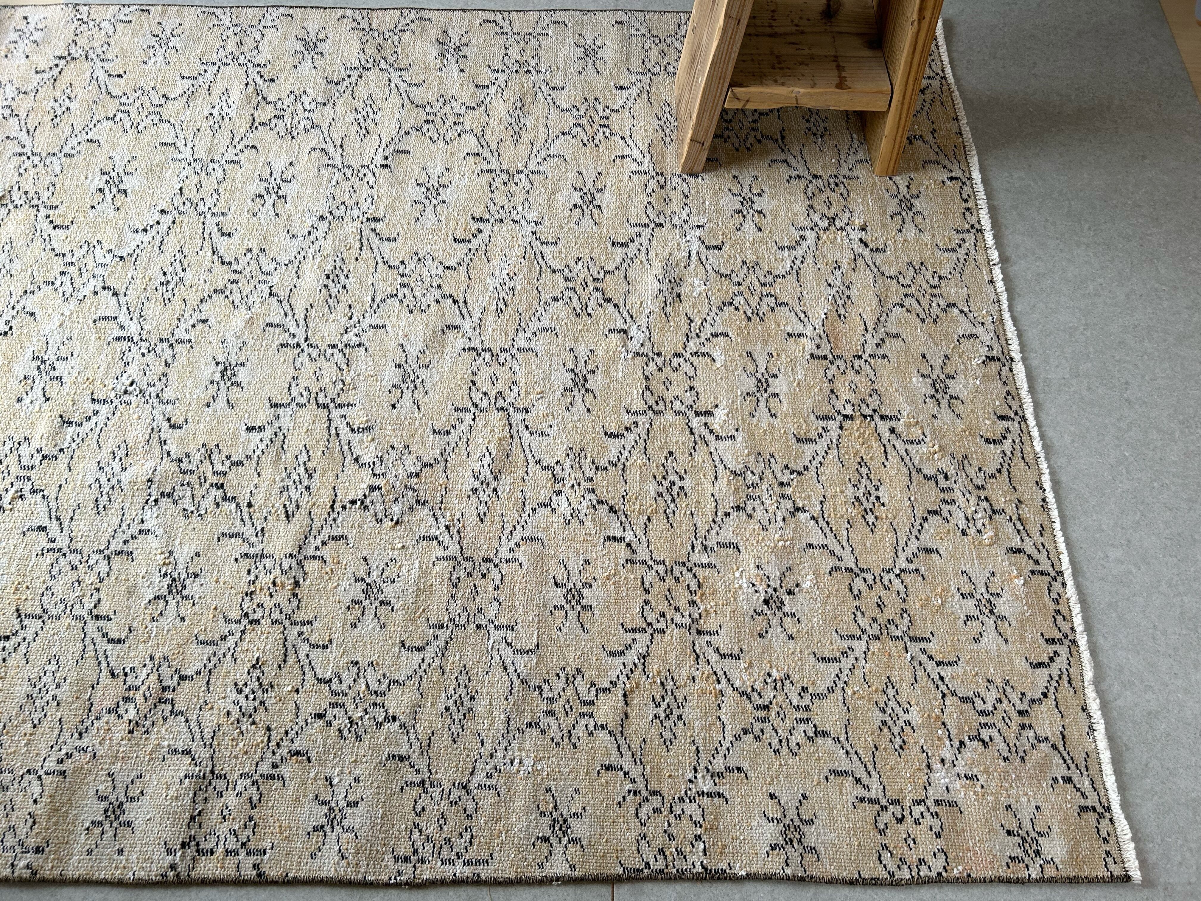 優しいアイボリー(ややベージュ寄り)のベースカラーに大きめのフワッとした花柄のラグ。