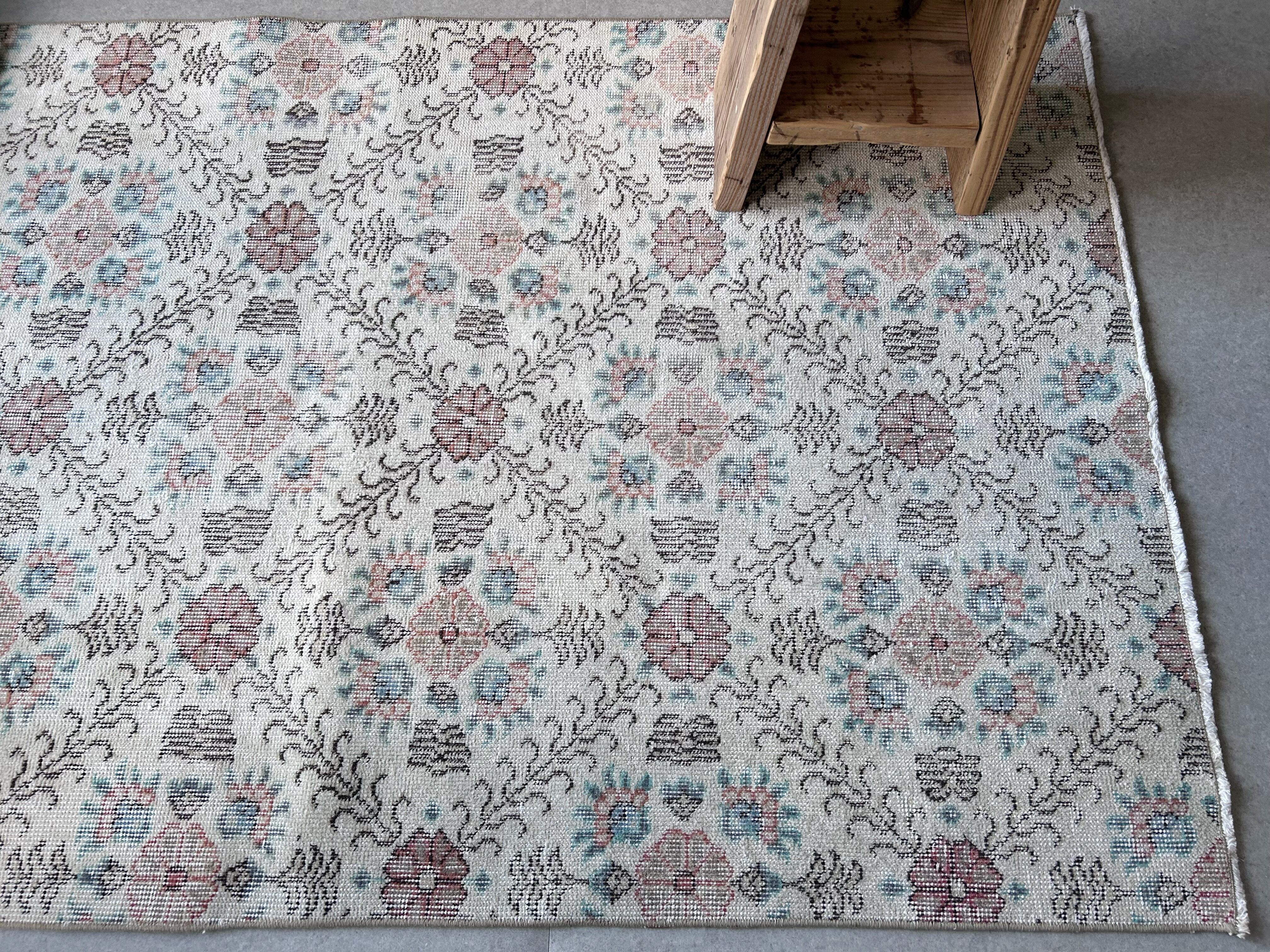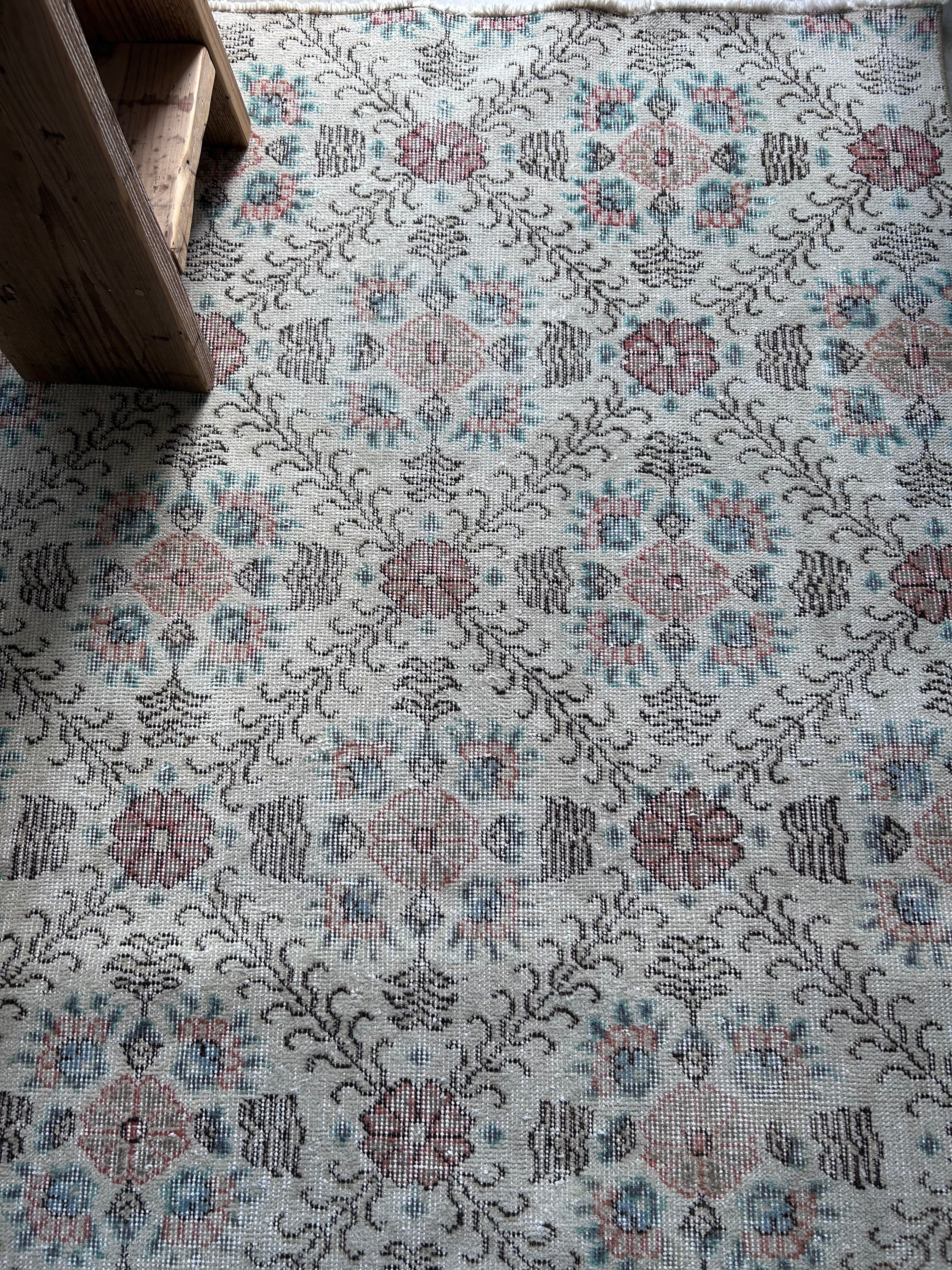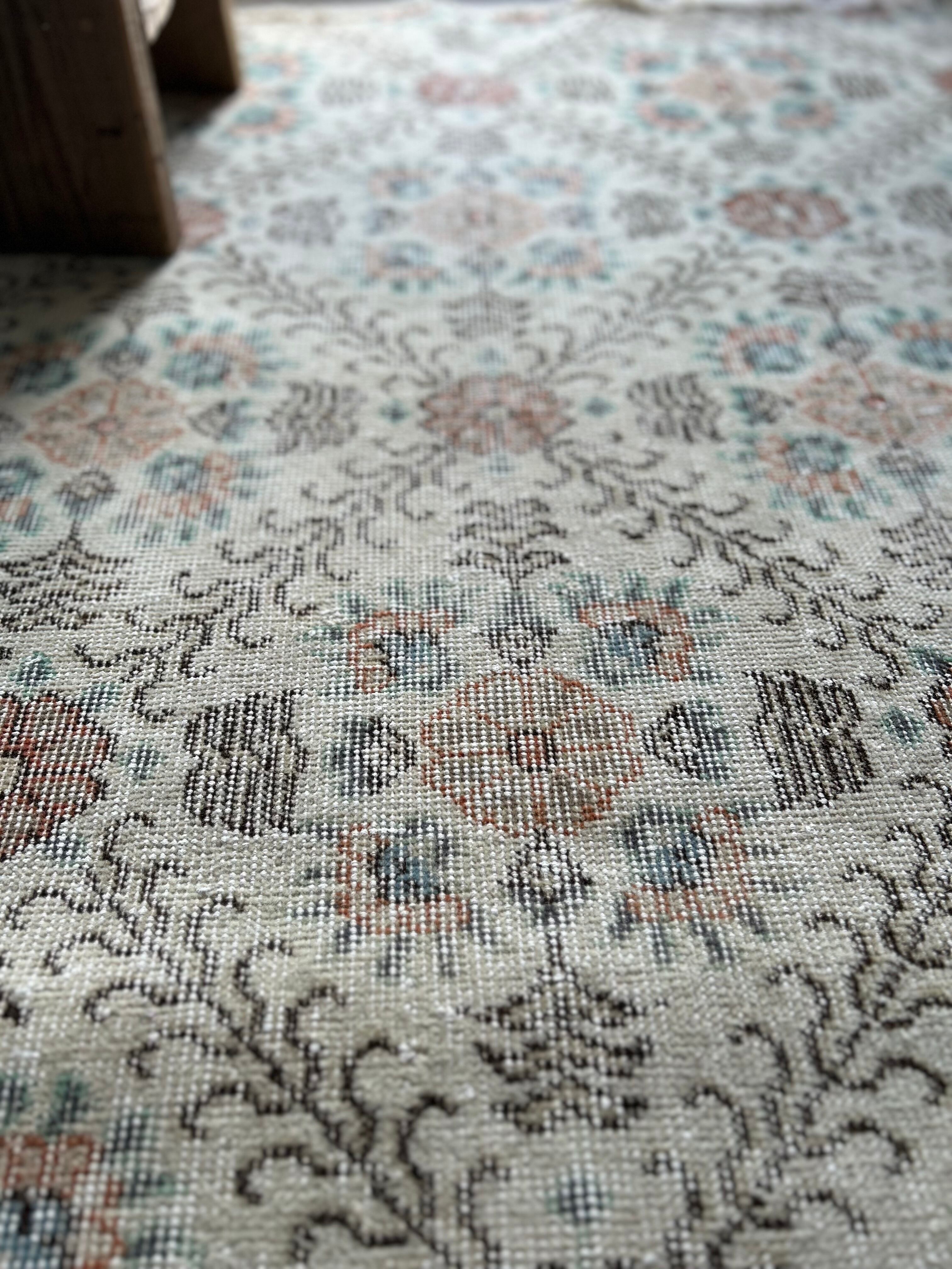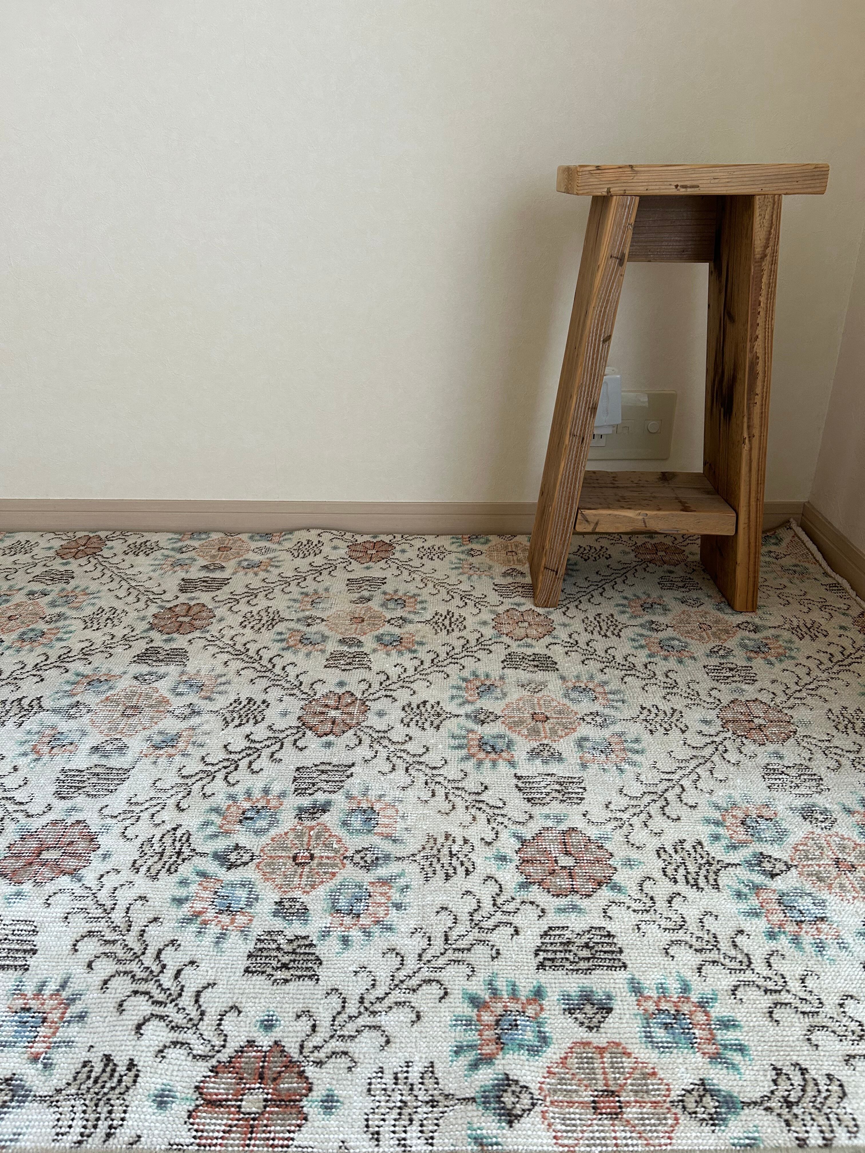 ナチュラルなアイボリーのベースカラーにとても馴染むように色褪せた淡い色味のラグ。